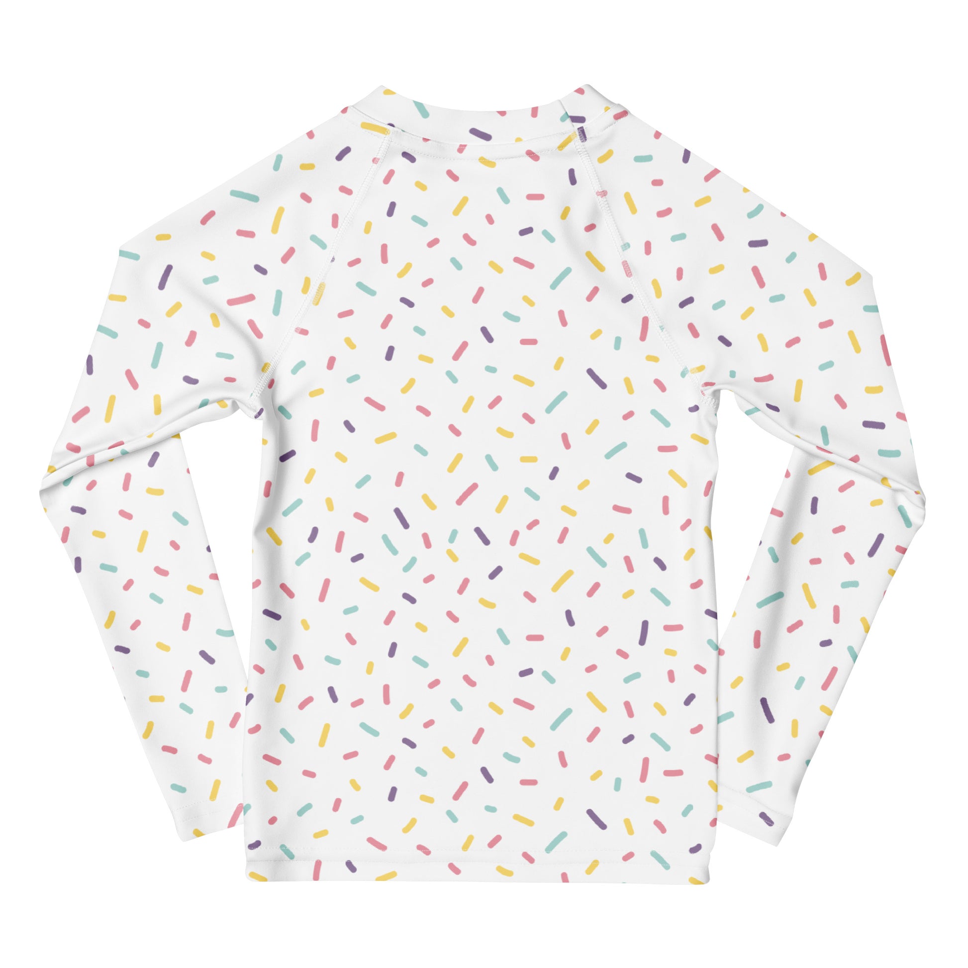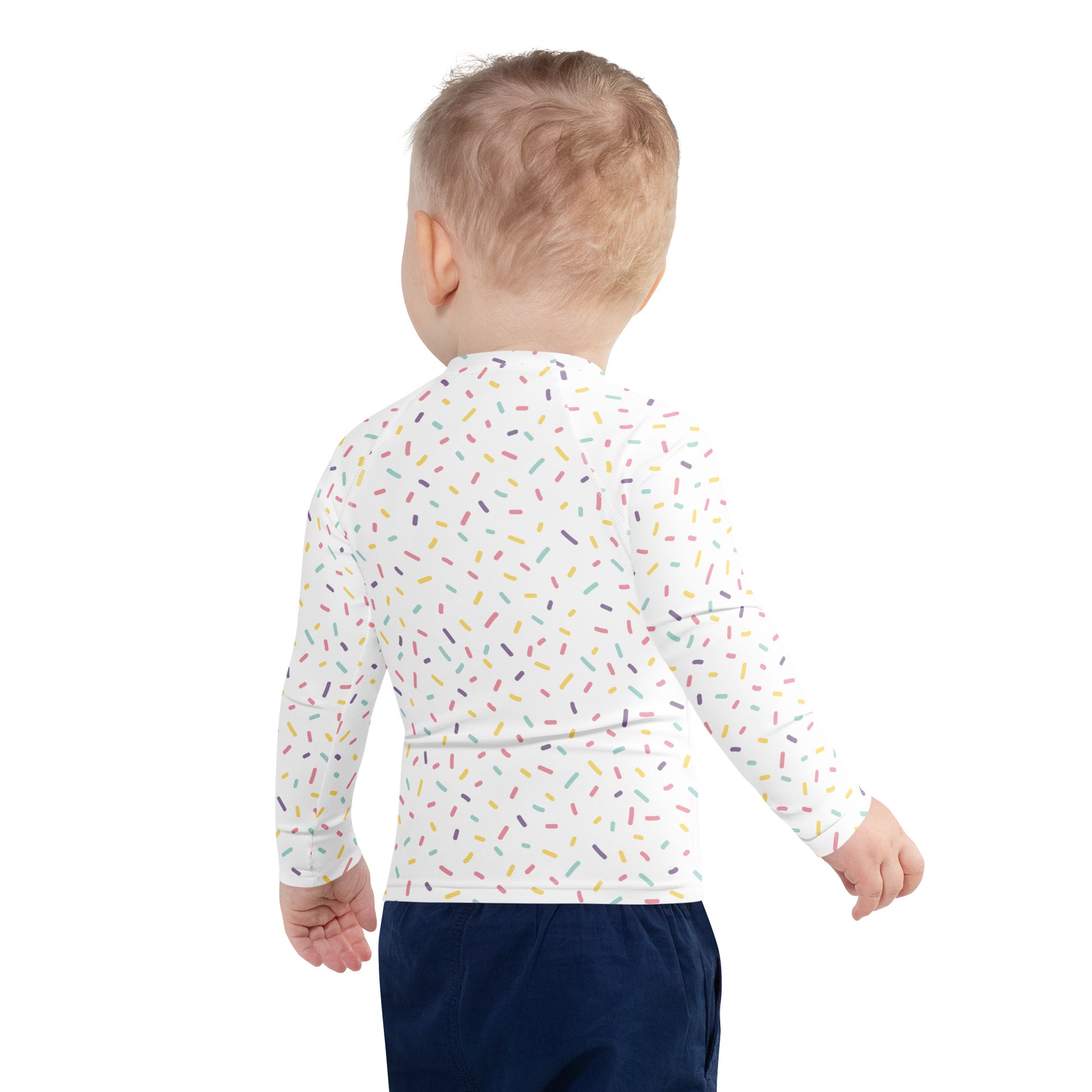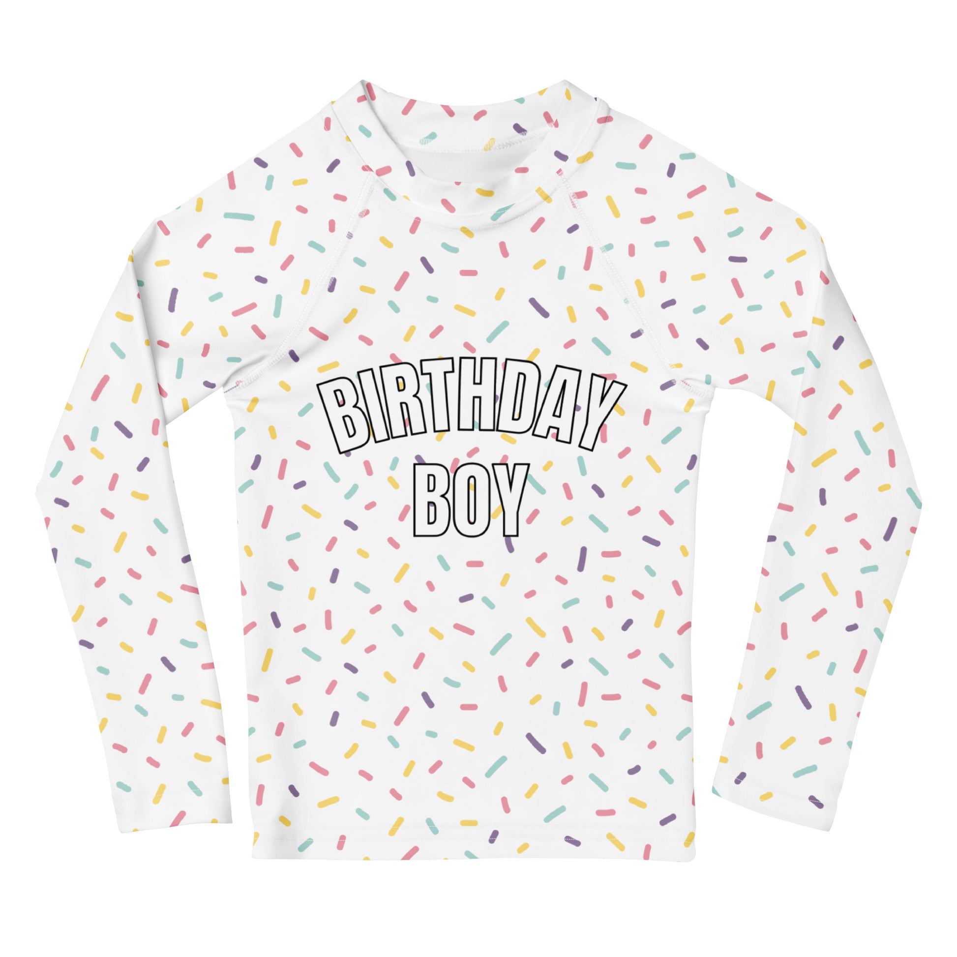 The perfect swim shirt for birthday parties, pool fun, or backyard adventures—this sprinkle-themed rash guard brings the joy of cake and confetti wherever he goes!