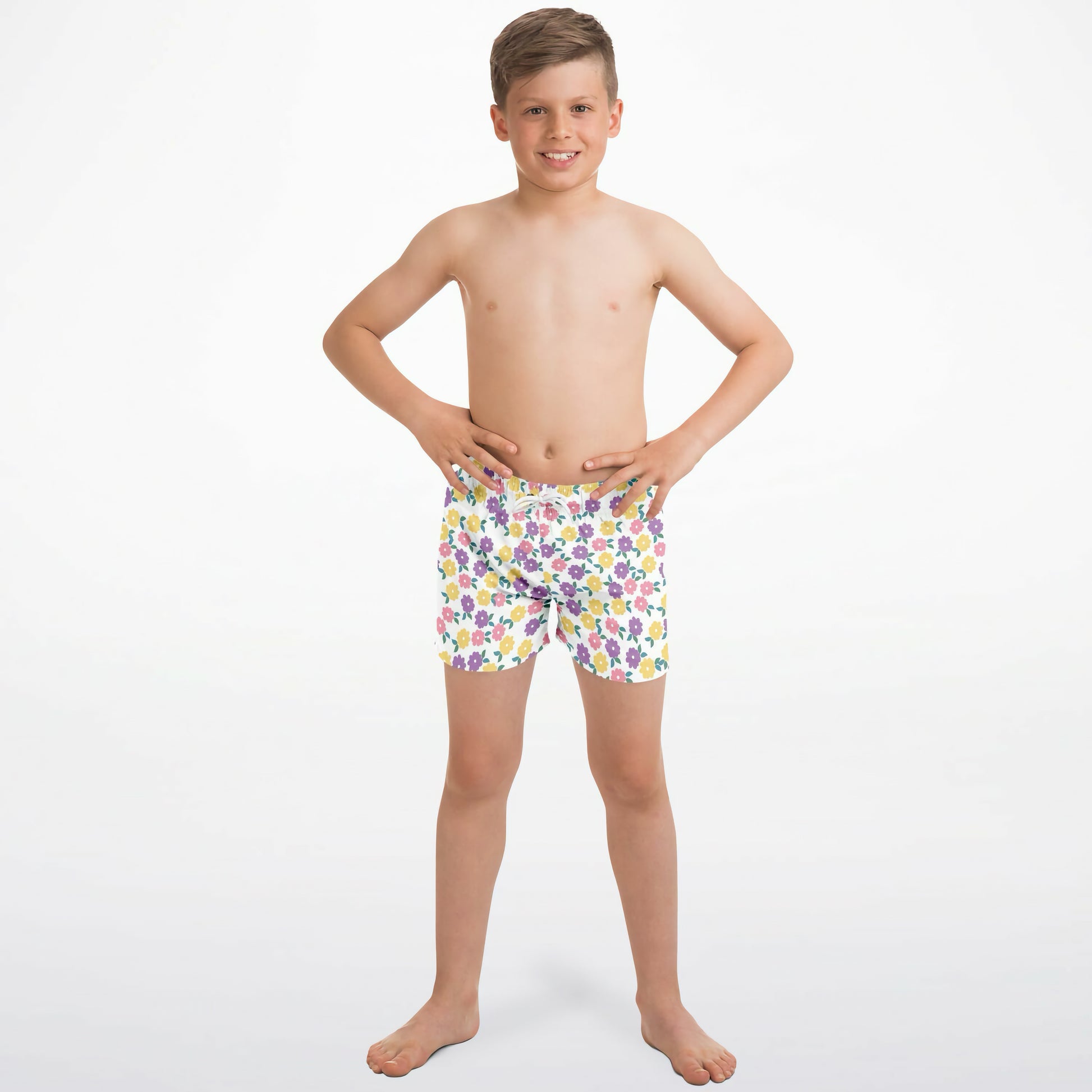 Let his personality bloom with these bold boys' flower print swim trunks. Featuring an all-over design of vibrant purple, yellow, and pink flowers, these shorts are perfect for pool parties, summer vacations, and tropical getaways. Made with quick-dry fabric and a breathable mesh lining, they’re built for comfort, movement, and all-day play. The elastic waistband and adjustable drawstring give growing boys a flexible fit—making these trunks a fun, standout choice for water-loving kids.