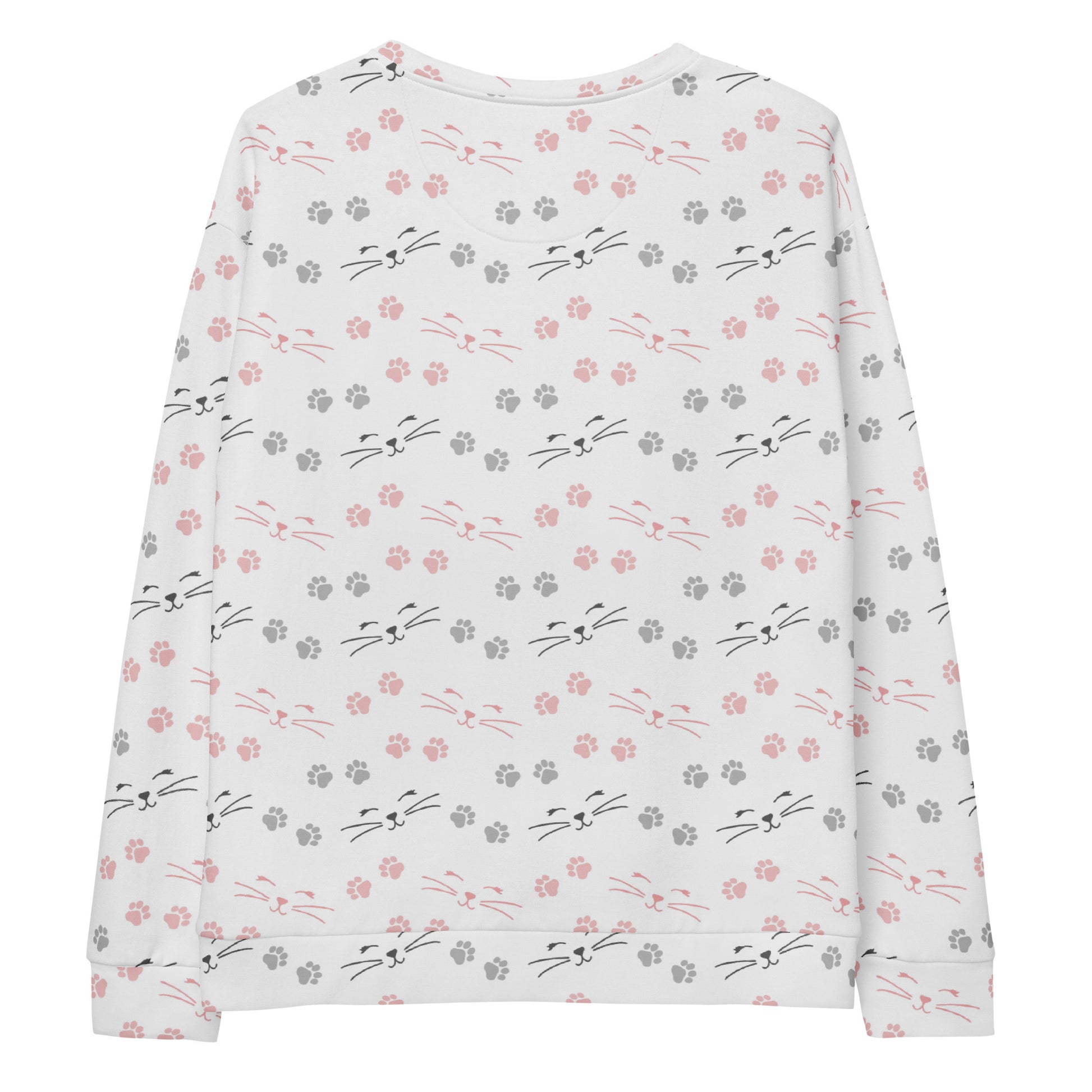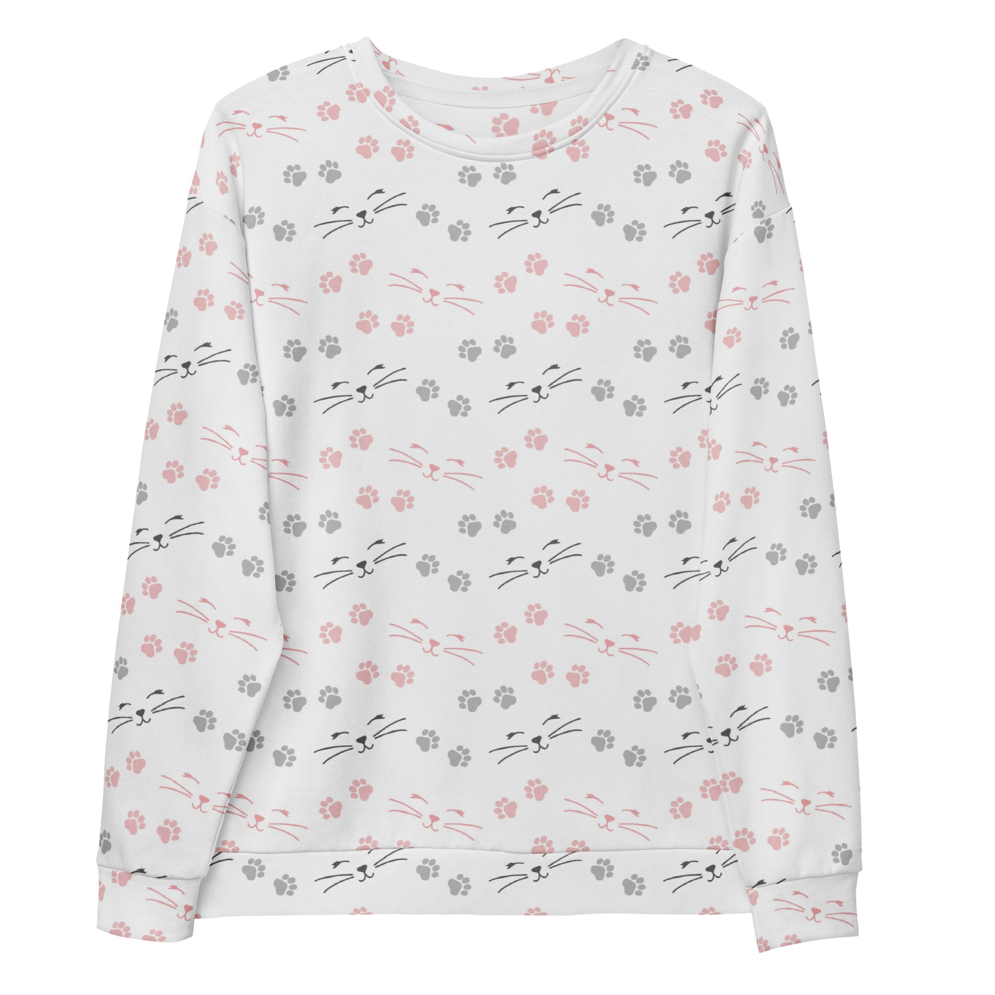 Show off your love for cats with this Cat Paw Print Sweatshirt! Featuring an adorable all-over design of kitty whisker faces and soft pastel paw prints, this cozy pullover is the perfect mix of cute and casual. Made with recycled fabric and brushed fleece inside, it’s soft on the skin while staying eco-friendly.