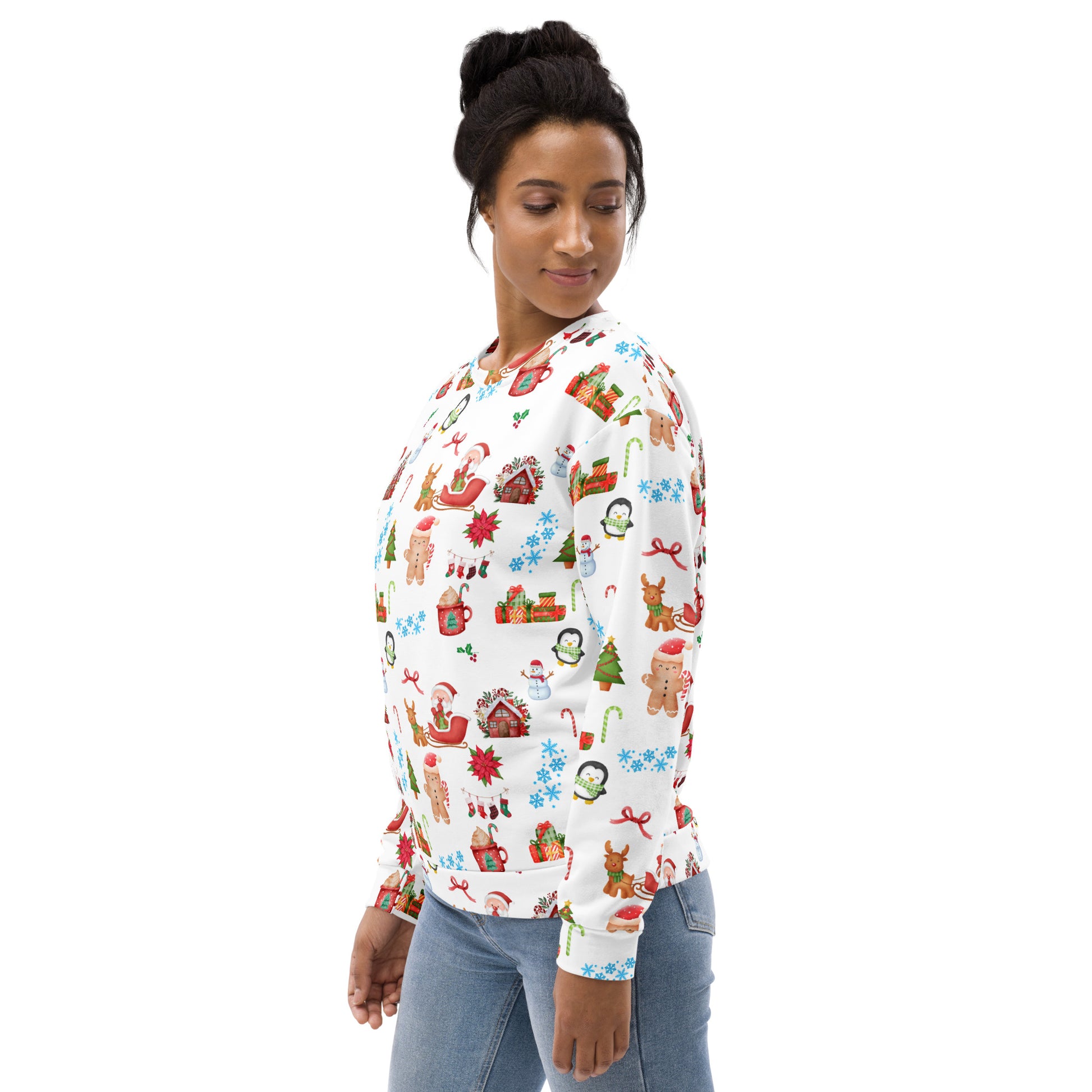 Bring holiday cheer wherever you go with this Christmas Collage Sweatshirt! Covered in a joyful all-over print of gingerbread men, Santa Claus, reindeer, penguins, gifts, and snowflakes, it’s the perfect pullover for Christmas morning, holiday parties, or cozy winter nights. Made from eco-friendly recycled fabric with a brushed fleece lining, this sweatshirt is soft, warm, and durable — a must-have for holiday lovers.