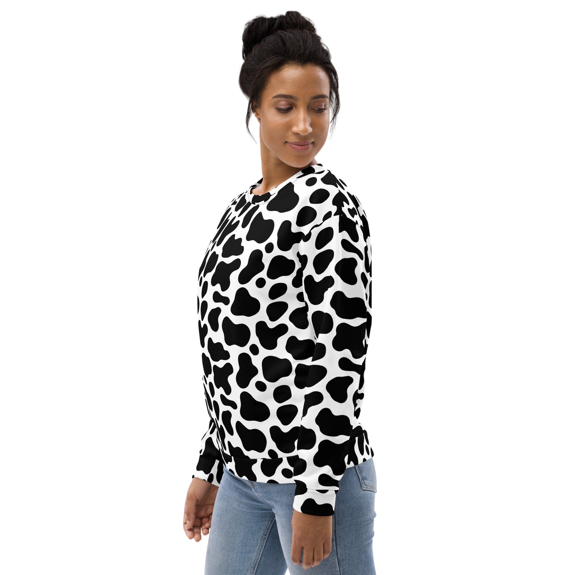 Add some bold personality to your wardrobe with our Cow Print Sweatshirt. Featuring an all-over black and white animal print. This cozy sweatshirt is the perfect fit. Soft on the outside, brushed fleece on the inside, and made with eco-friendly recycled fabric.