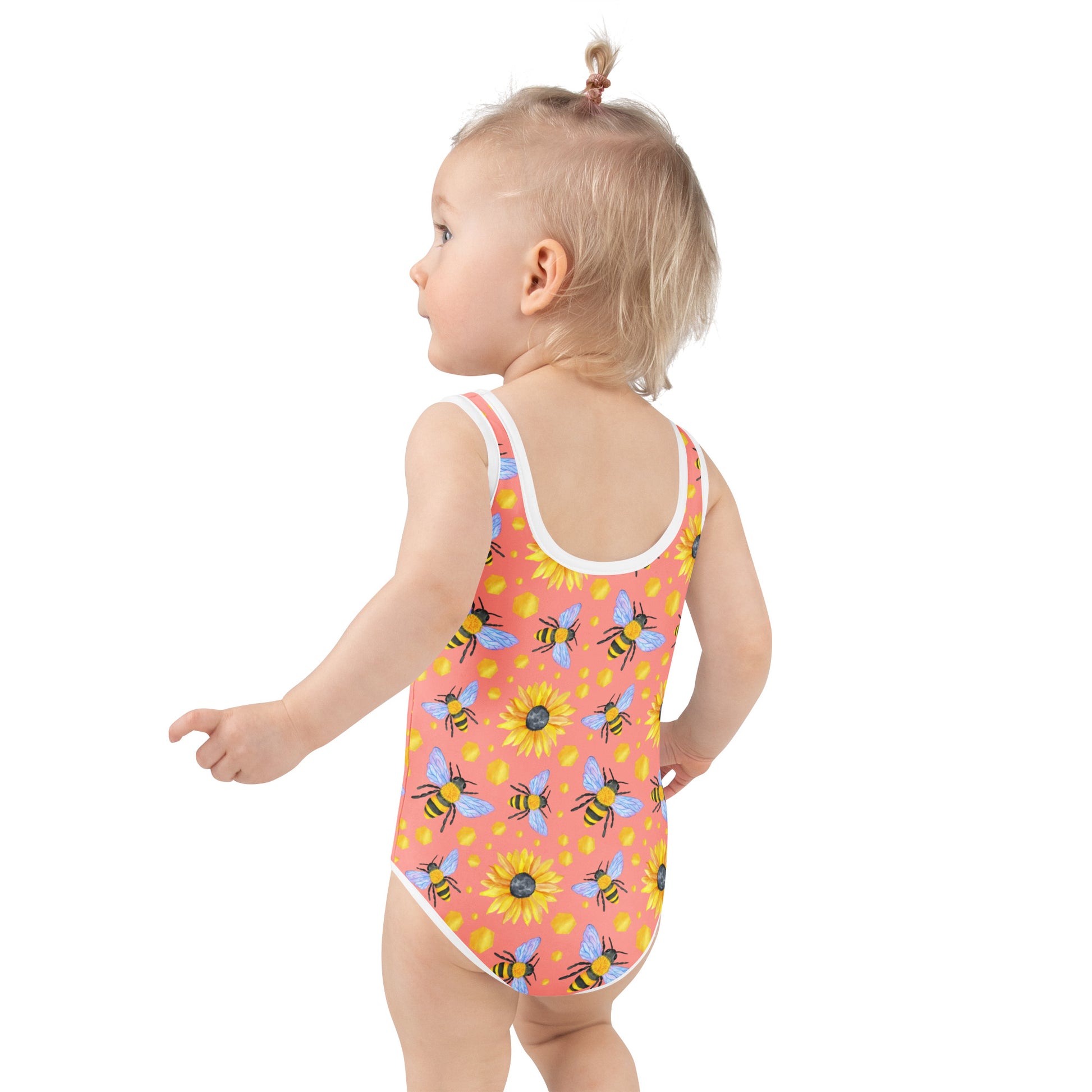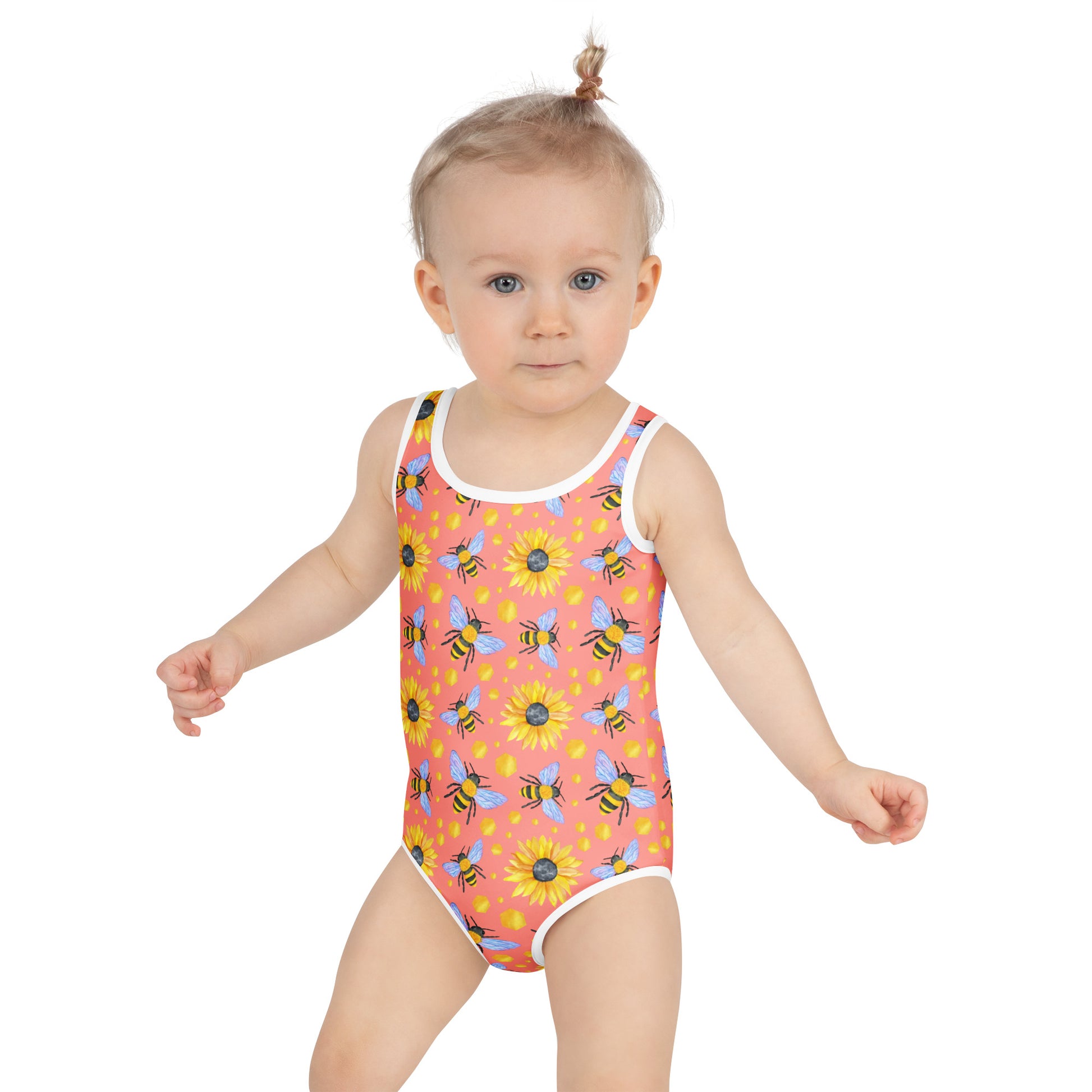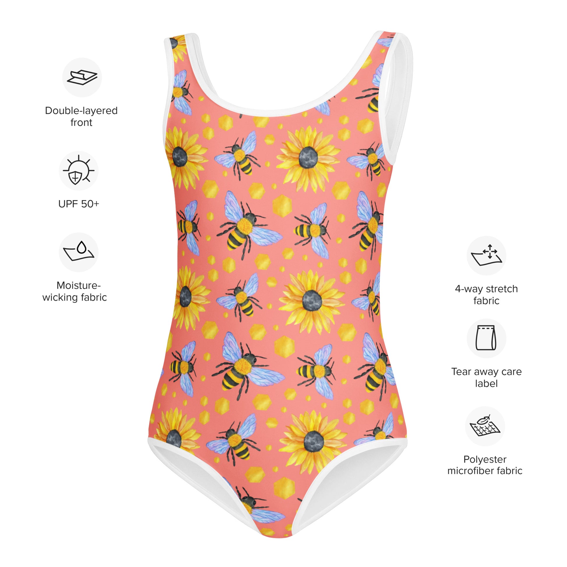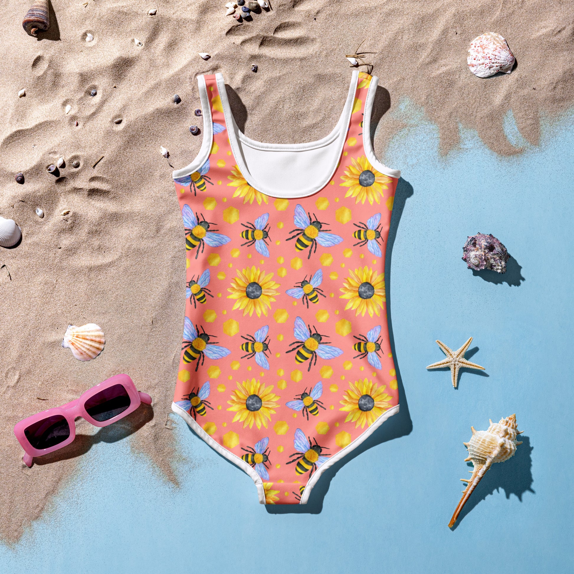 Bring on the buzz with this cheerful bee and sunflower one-piece swimsuit! Perfect for girls who love bumblebees and playful summer style, this bright design features hand-drawn buzzing bees and golden sunflowers over a soft coral-pink backdrop. Whether it’s for beach days, backyard play, or poolside fun, this suit is made to move, splash, and shine.