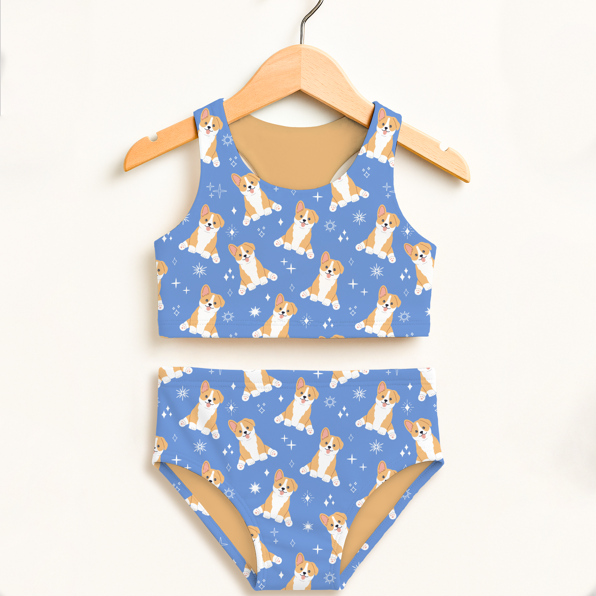 Girls Blue Corgi Dog Two Piece Swimsuit – High Waisted, Double Layered Comfort