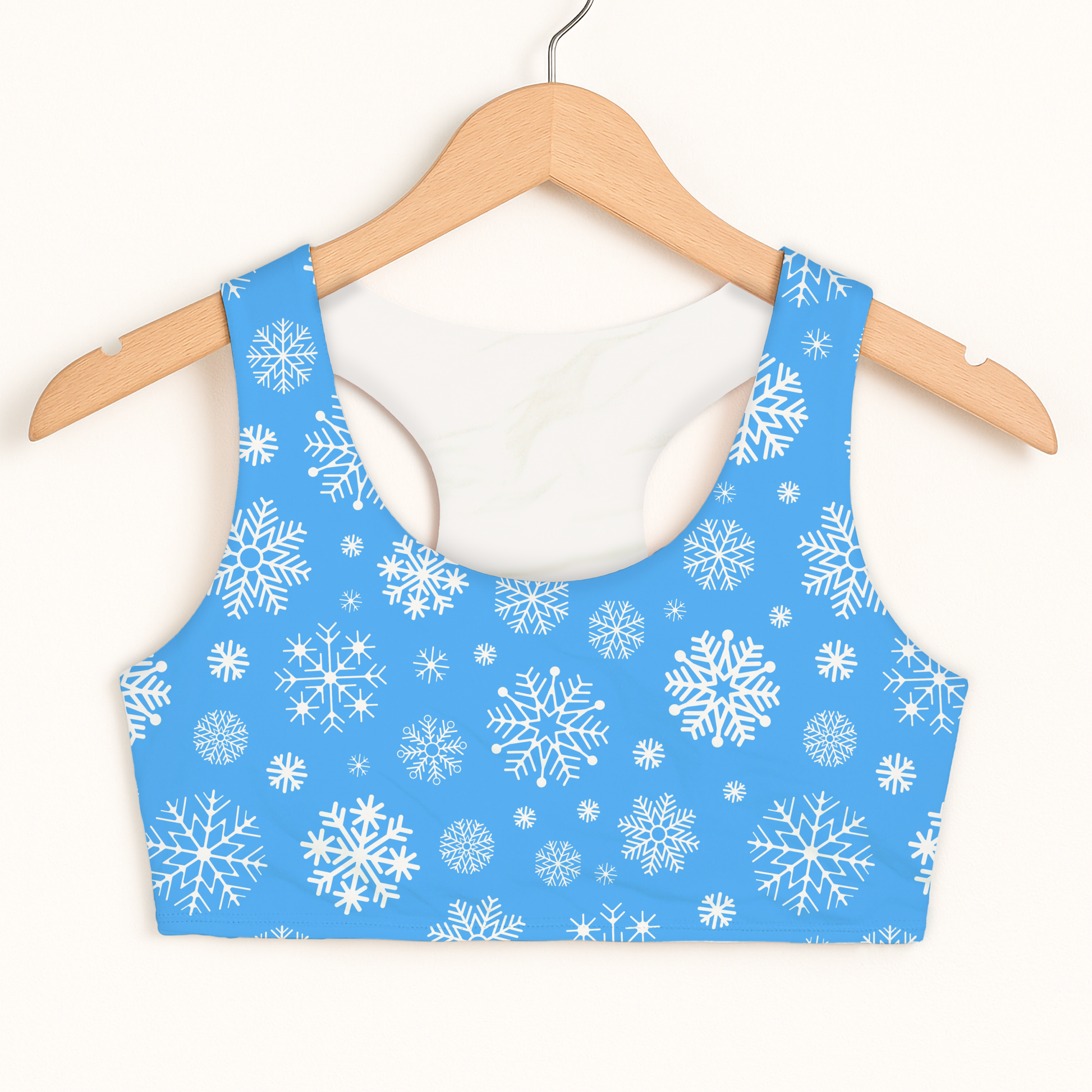 This girls’ sports bra sparkles with wintry charm, featuring a bright blue background covered in crisp white snowflakes. Perfect for Christmas outfits, dance recitals, cheer practice, or cozy winter workouts, it brings festive style with plenty of comfort.