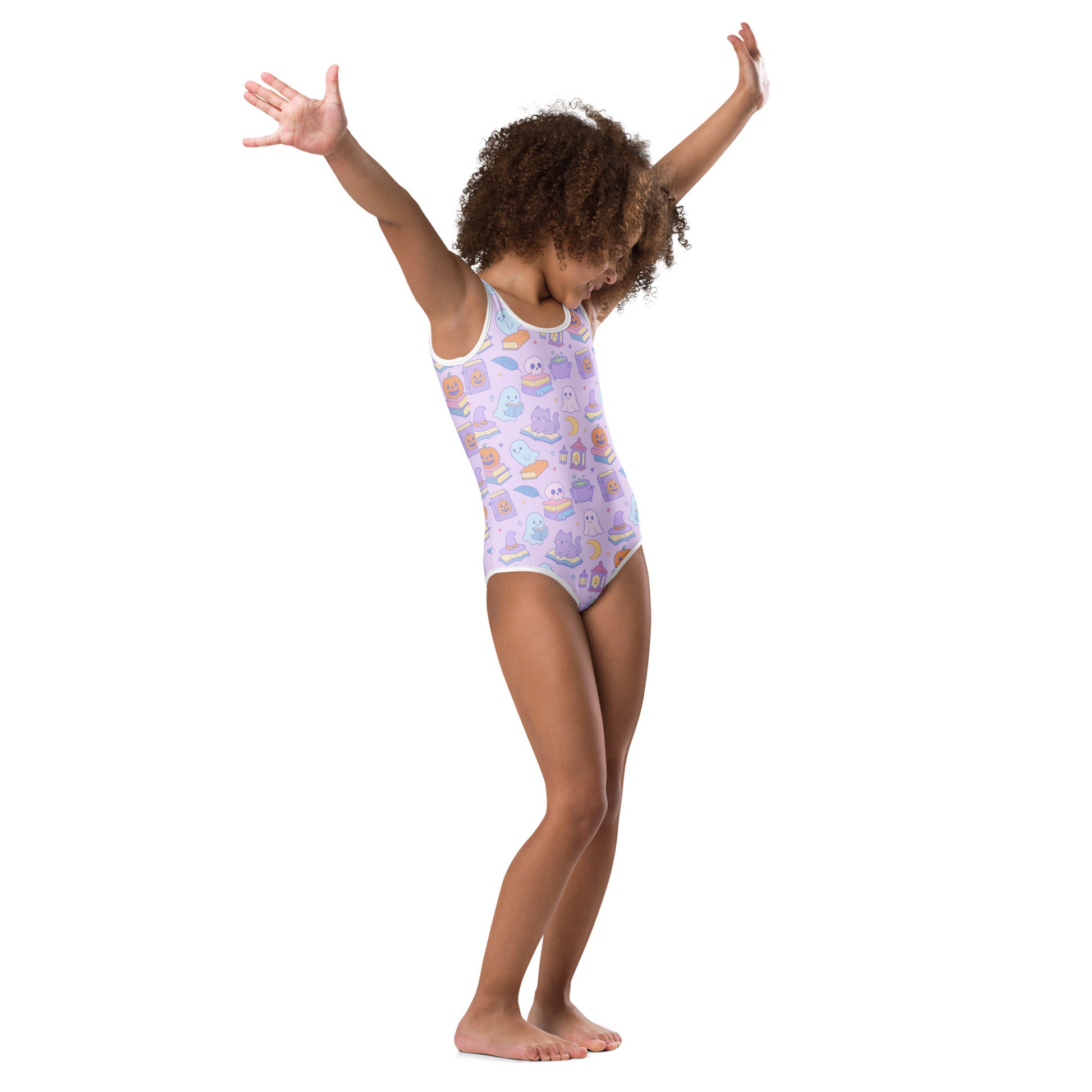 Let her cast some seriously cute spells in this pastel Halloween leotard! With smiling ghosts, magical books, potions, cats, pumpkins, and moons all set against a dreamy lavender background, this outfit is perfect for toddlers and girls who love both magic and movement. Whether she’s flipping through dance class or casting imaginary spells at home, she’ll feel comfy and free to move.