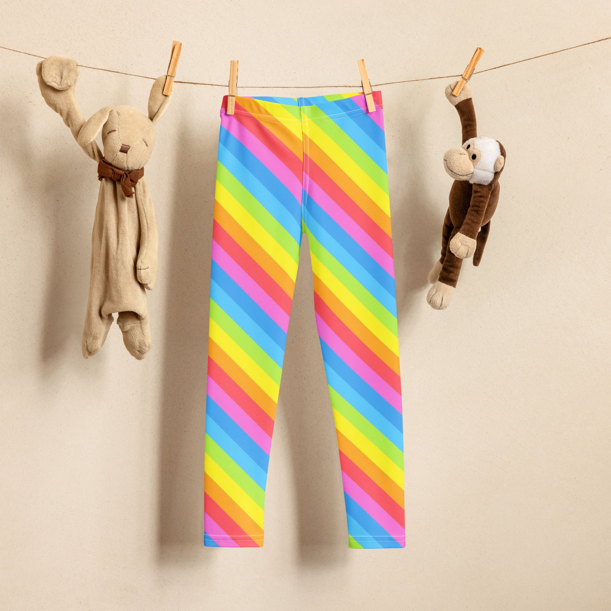 Add a pop of joy to her wardrobe with these bright rainbow striped leggings! Designed with bold diagonal stripes in pink, orange, yellow, green, blue, and purple, these colorful leggings are made for toddlers and kids who love to stand out and express themselves.