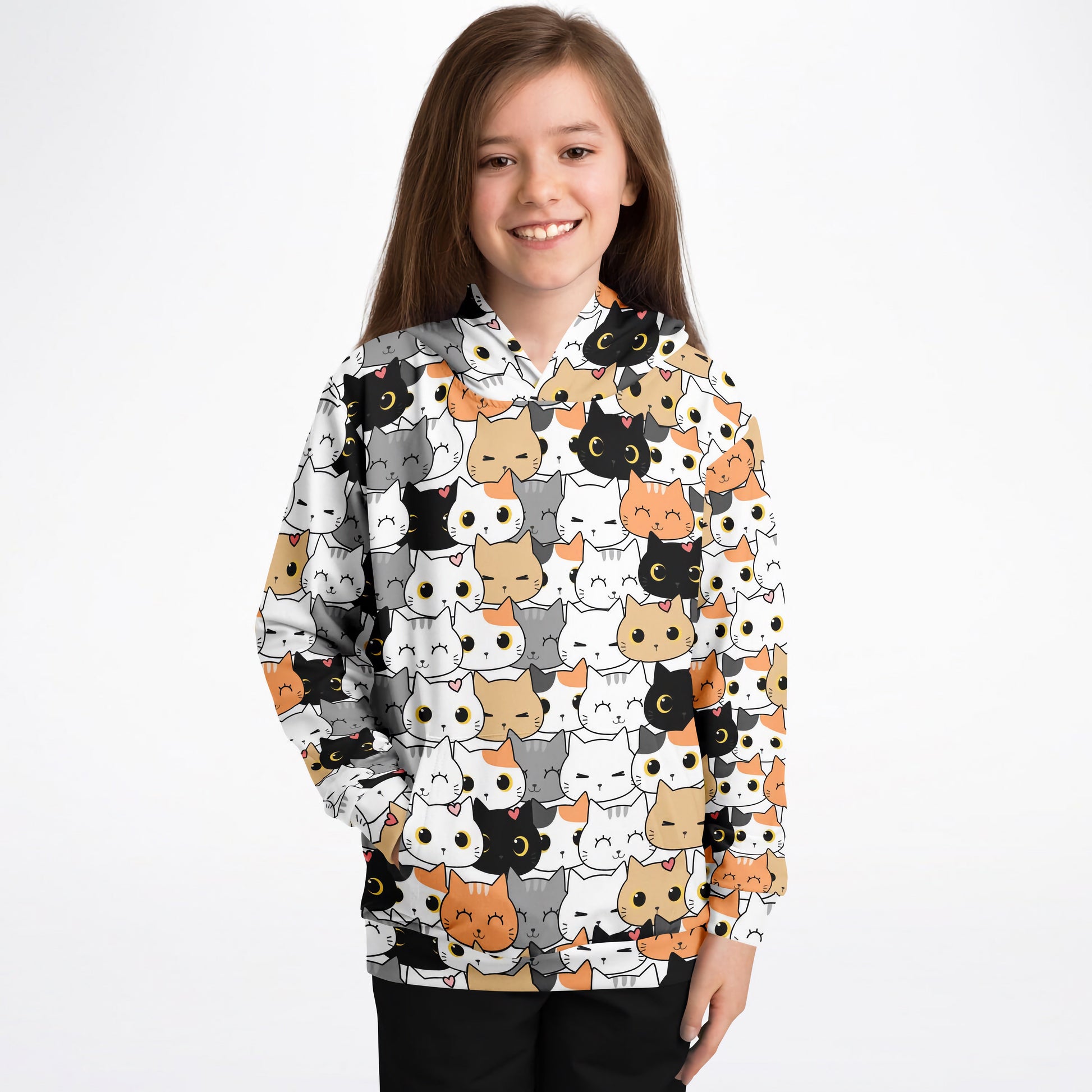 Introducing our Girls Cat Face Hoodie – a purr-fectly playful addition to your little one's wardrobe! Featuring an adorable all-over cat print, this hoodie brings warm comfort to toddlers and kids. Whether she’s out and about or lounging at home, this hoodie is sure to be a favorite for all kitten lovers.