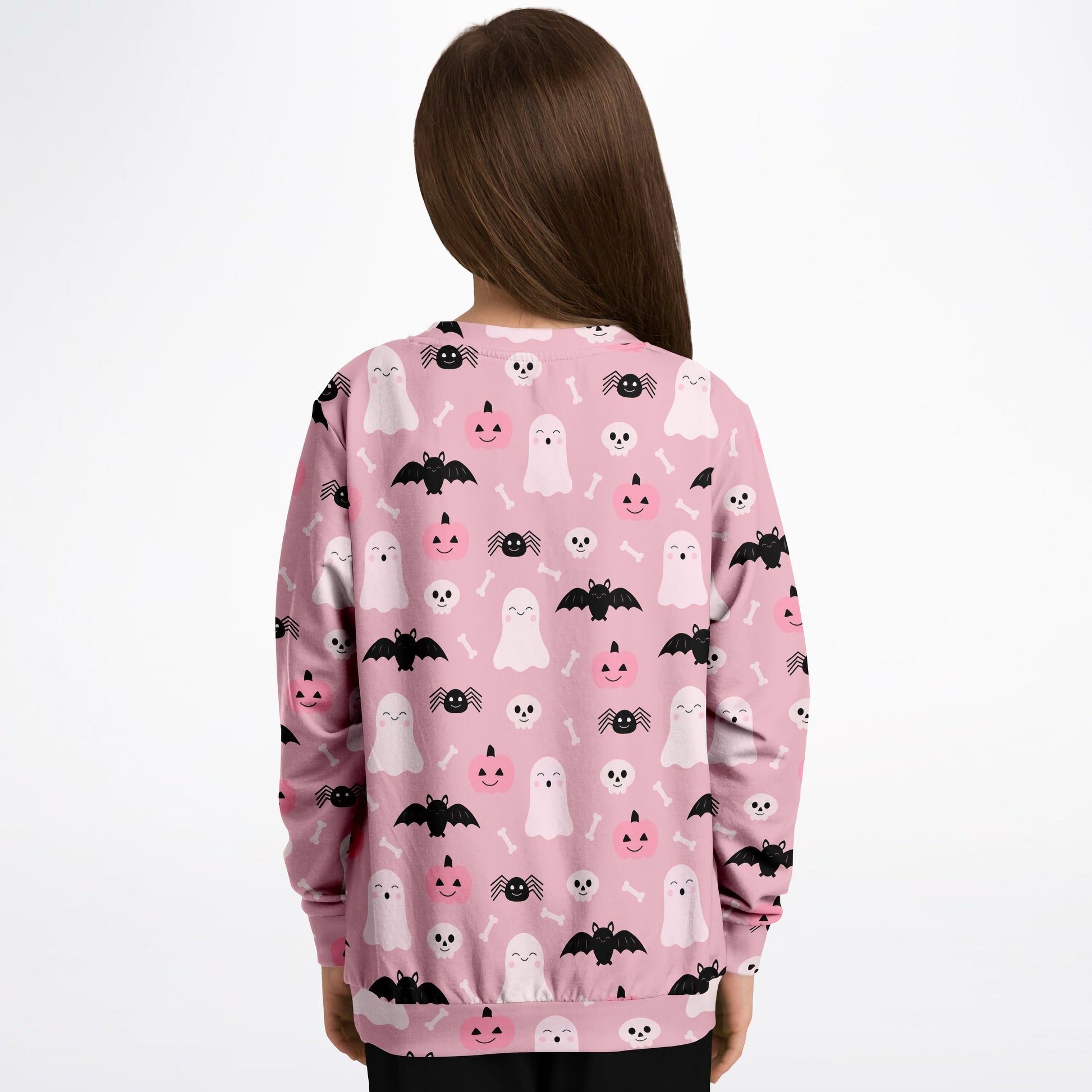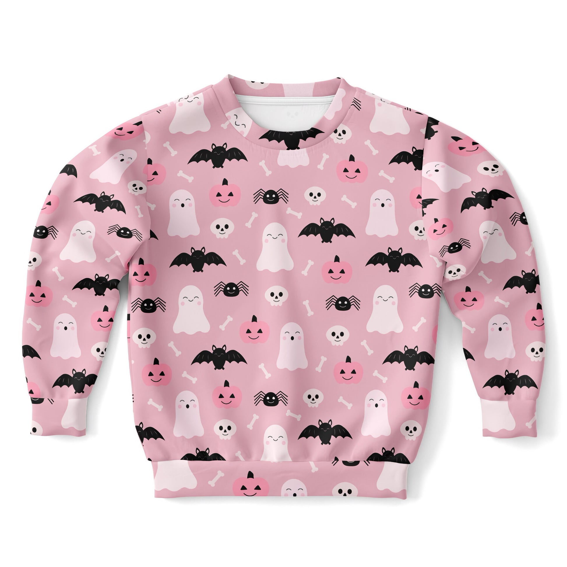 Girls Cute Ghost And Bats Pink Halloween Sweatshirt – Cozy Cotton Fleece or Lightweight Sports Fabric