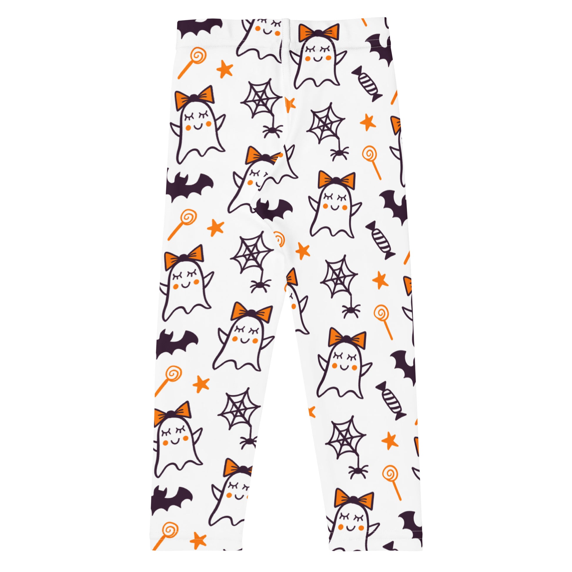 These sweet little ghost leggings are full of Halloween charm—without the scare! Featuring adorable ghost characters with orange bows, playful candy, spiderwebs, stars, and bats, these leggings are perfect for little ones who love the fun side of spooky season.