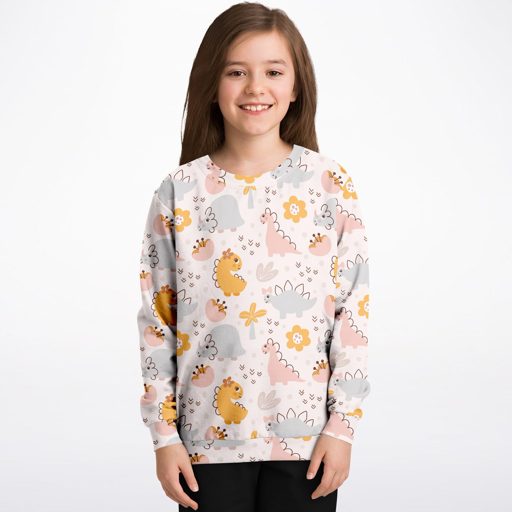 Girls Floral Dinosaur Sweatshirt – Cozy Cotton Fleece or Lightweight Sports Fabric