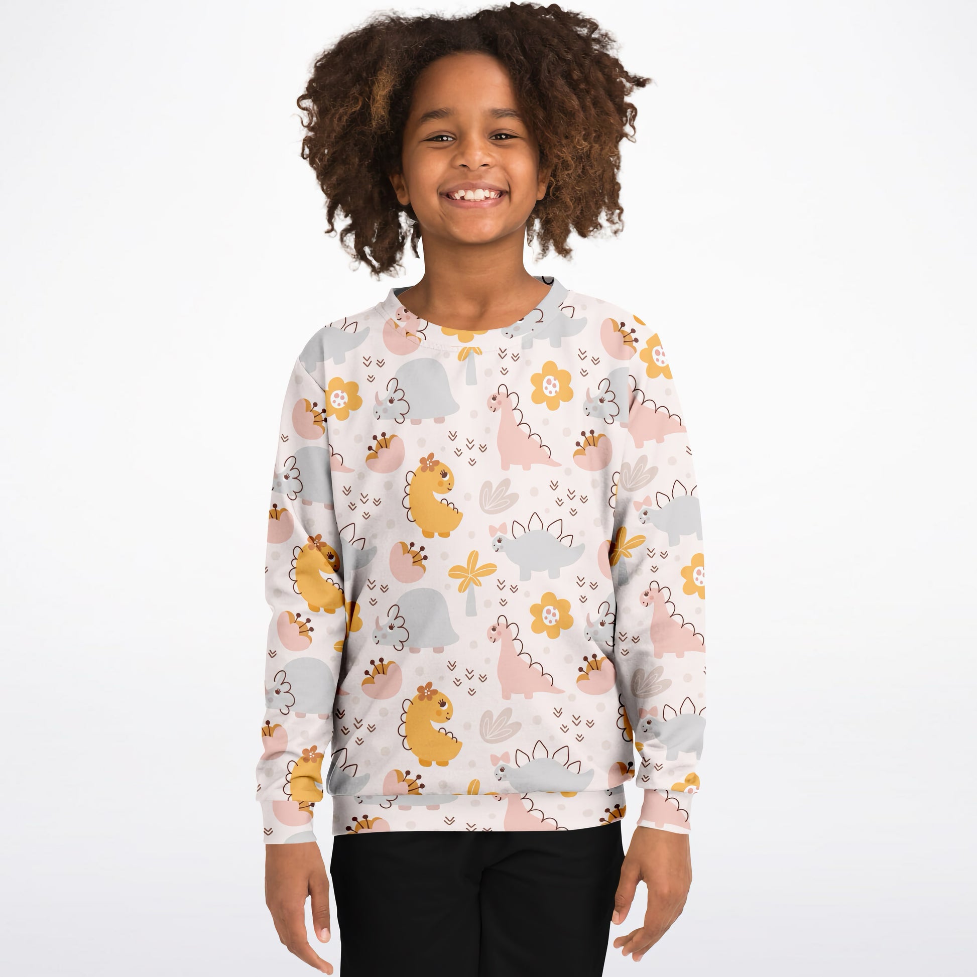 Bring prehistoric charm to your child’s wardrobe with this Kids Pastel Dinosaur Sweatshirt. Featuring pink, gray, and golden-yellow dinosaurs surrounded by flowers and leaves, this cozy pullover is a playful twist on a classic favorite. Perfect for toddlers and kids who love dinos, it’s soft, comfy, and ready for everyday adventures.