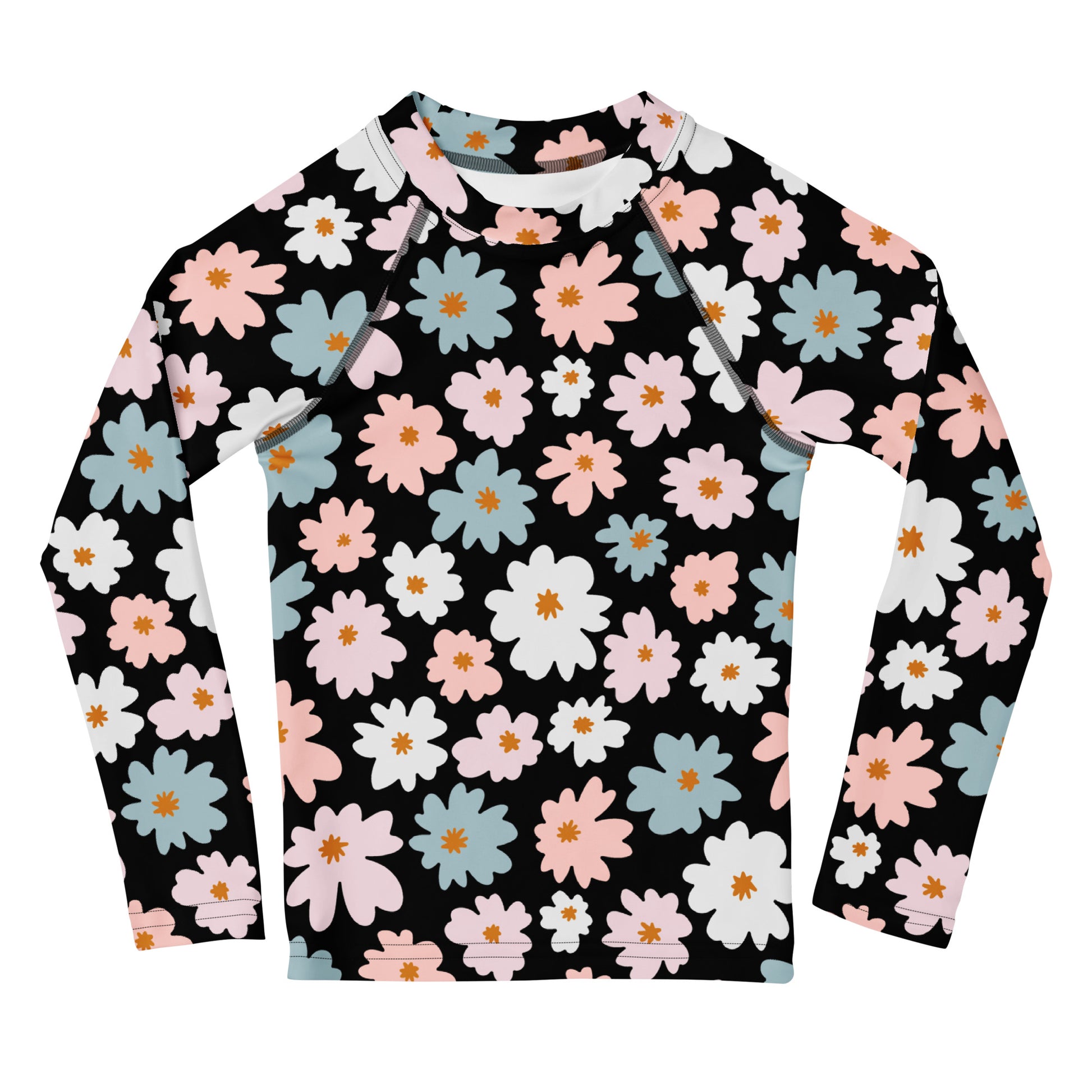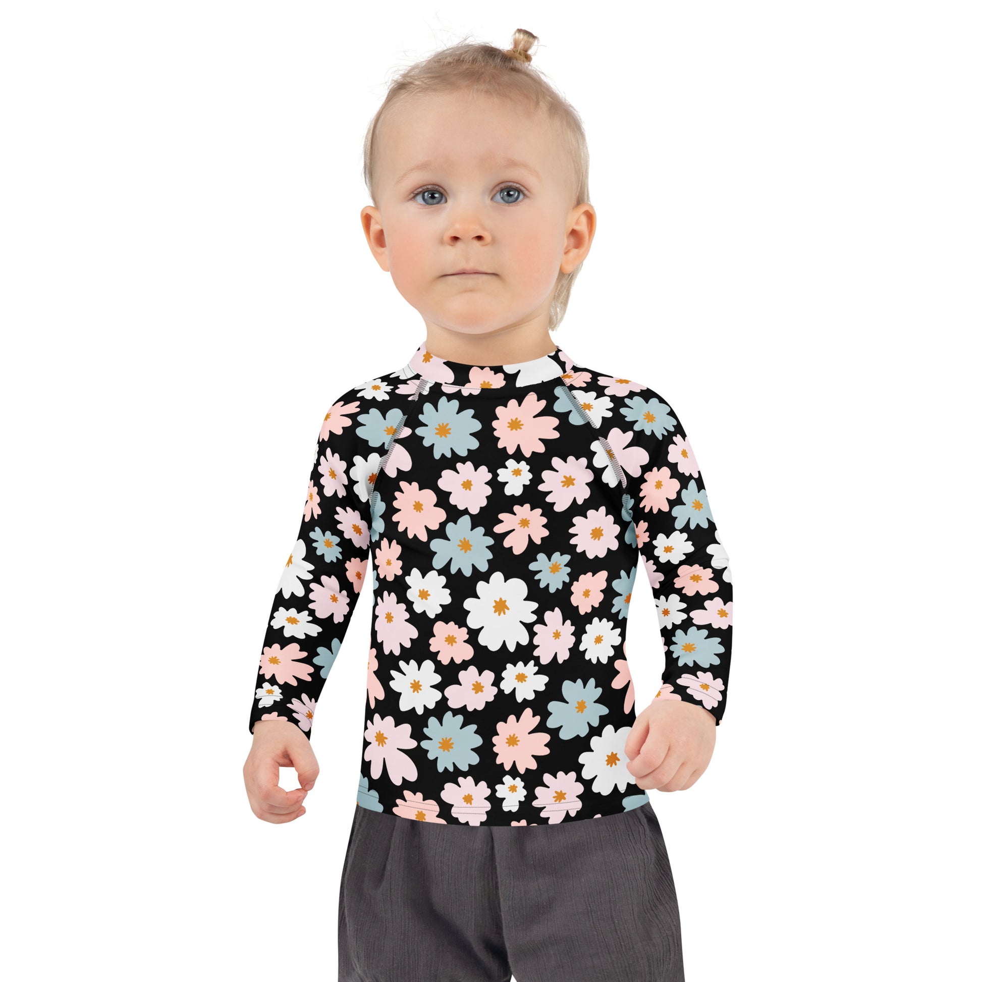 Add a splash of bold style to her swimwear with this black floral rash guard for girls. Covered in cheerful pastel blooms, it’s a standout piece that combines playful charm with full sun coverage—perfect for toddlers and kids who love making waves in style.