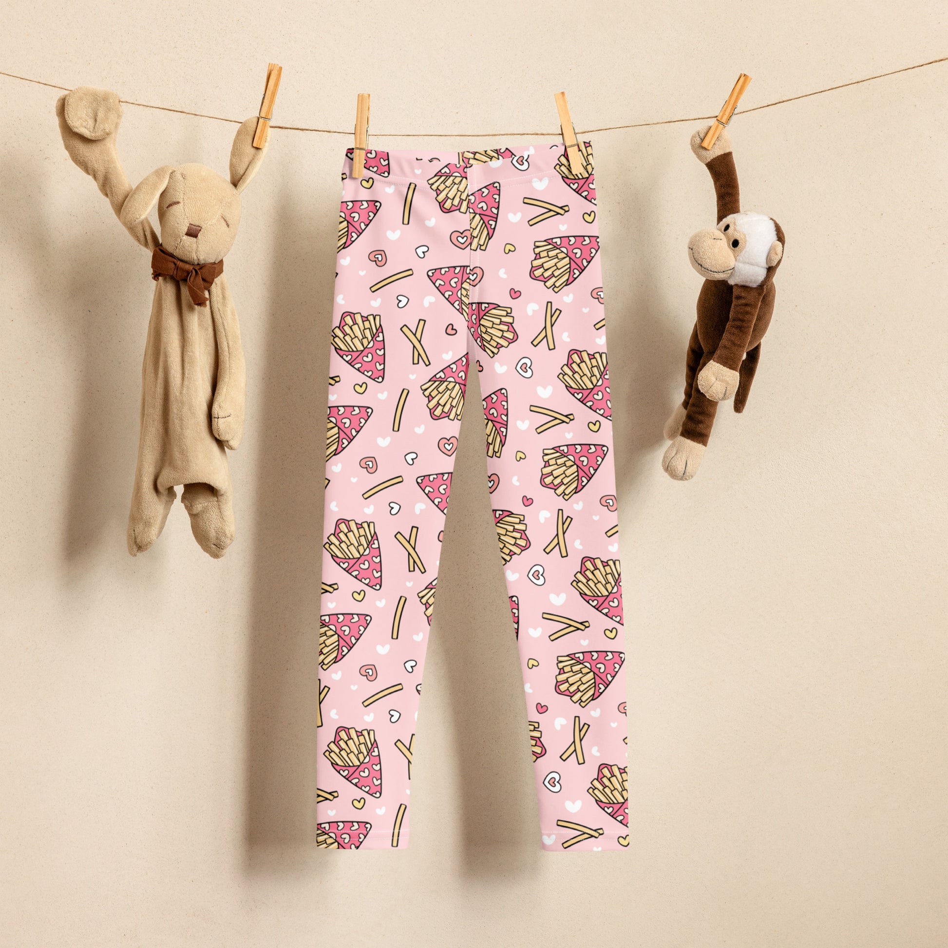 These pink kids’ leggings serve up a super fun junk food print filled with golden fries. Perfect for snack-loving fashionistas who like their outfits bold, playful, and adorable.