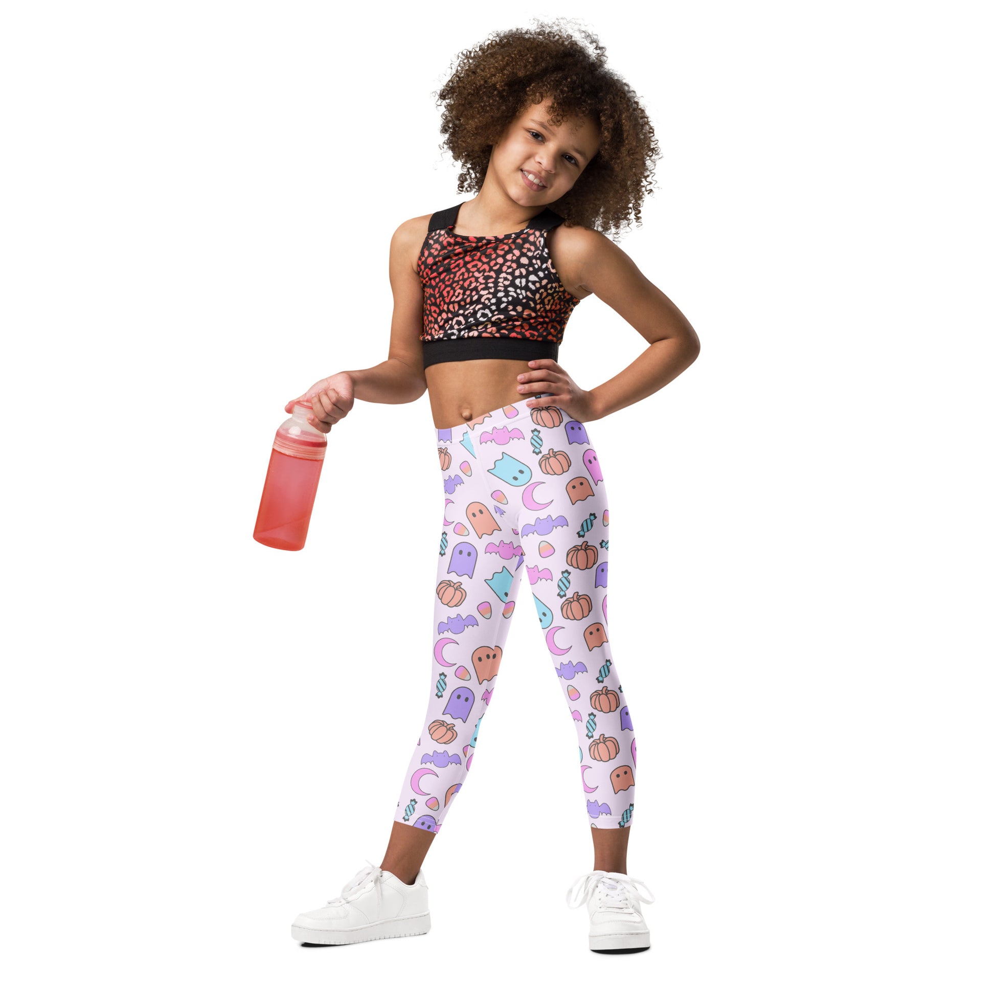 Spooky season just got sweet! These pastel Halloween leggings are a treat for any girl who loves candy, ghosts, and colorful fun. Featuring a mix of lavender, peach, mint, and lilac ghosts, pumpkins, bats, candy, and moons on a soft blush background—these leggings bring the cutest kind of fright.