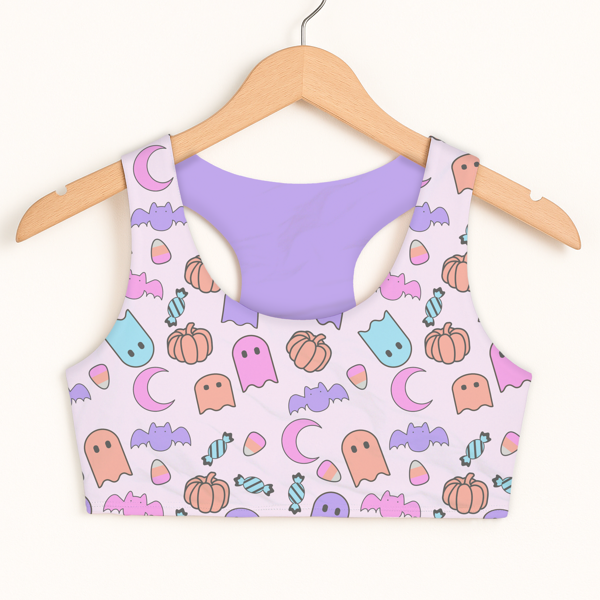Celebrate spooky season in style with this girls’ purple Halloween sports bra, featuring a pastel all-over print of ghosts, pumpkins, bats, candy, and crescent moons. Perfect for toddlers and older girls, it’s a playful choice for trick-or-treating, dance class, gymnastics, or everyday active fun.