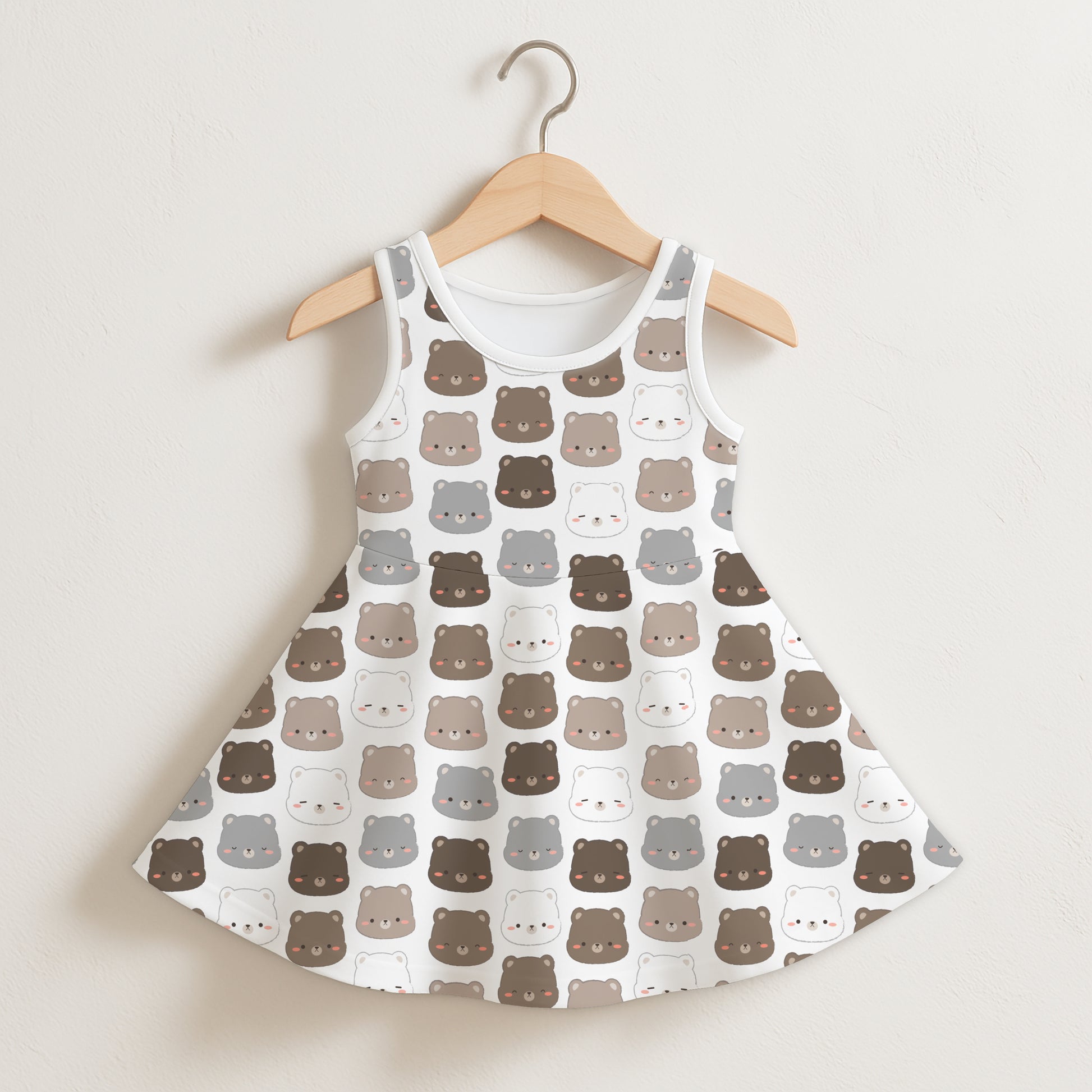 Let her show off her love for cuddly creatures in this Girls Kawaii Bear Dress! Featuring an all-over print of adorable cartoon bear faces in soft neutral tones, this twirly dress is perfect for toddlers and kids who adore animals and comfy playtime fashion. Whether it’s for daycare, weekend fun, or a birthday gift, this sweet bear-themed dress brings cozy charm to her everyday style.