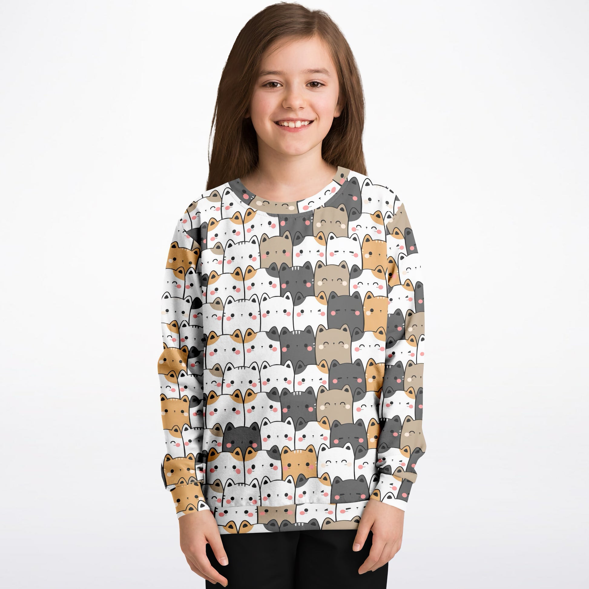 Turn every day into a purr-fect adventure with this Kids Cat Crowd Sweatshirt. Featuring rows of happy kitty faces in white, tan, gray, and black, this pullover is made for toddlers and kids who love cats. Cozy, colorful, and fun — it’s ideal for school, playdates, or lounging at home.