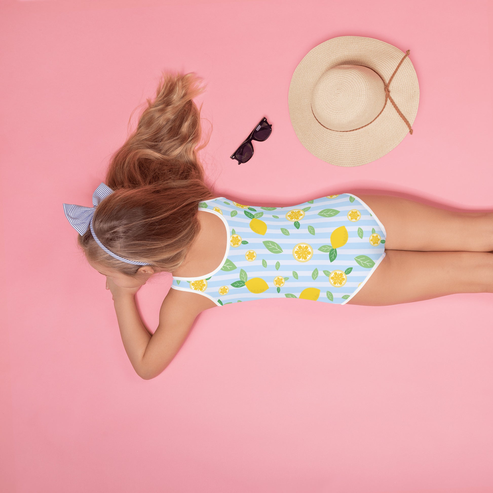 Sweet, sunny, and ready for summer! The Girls Lemon Stripe One-Piece Swimsuit features cheerful yellow lemons and fresh green leaves scattered across a light blue and white vertical stripe pattern—giving it a crisp, citrusy look that’s perfect for pool days, beach adventures, and family vacations.