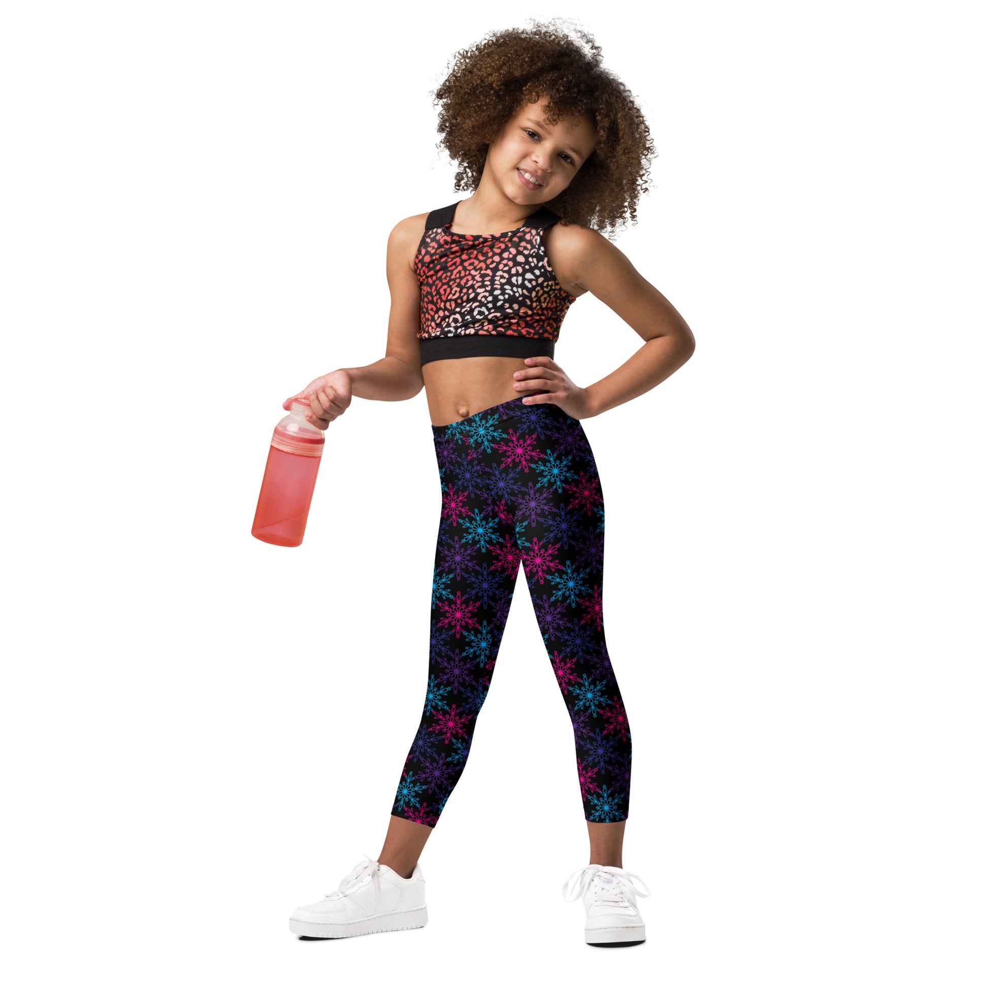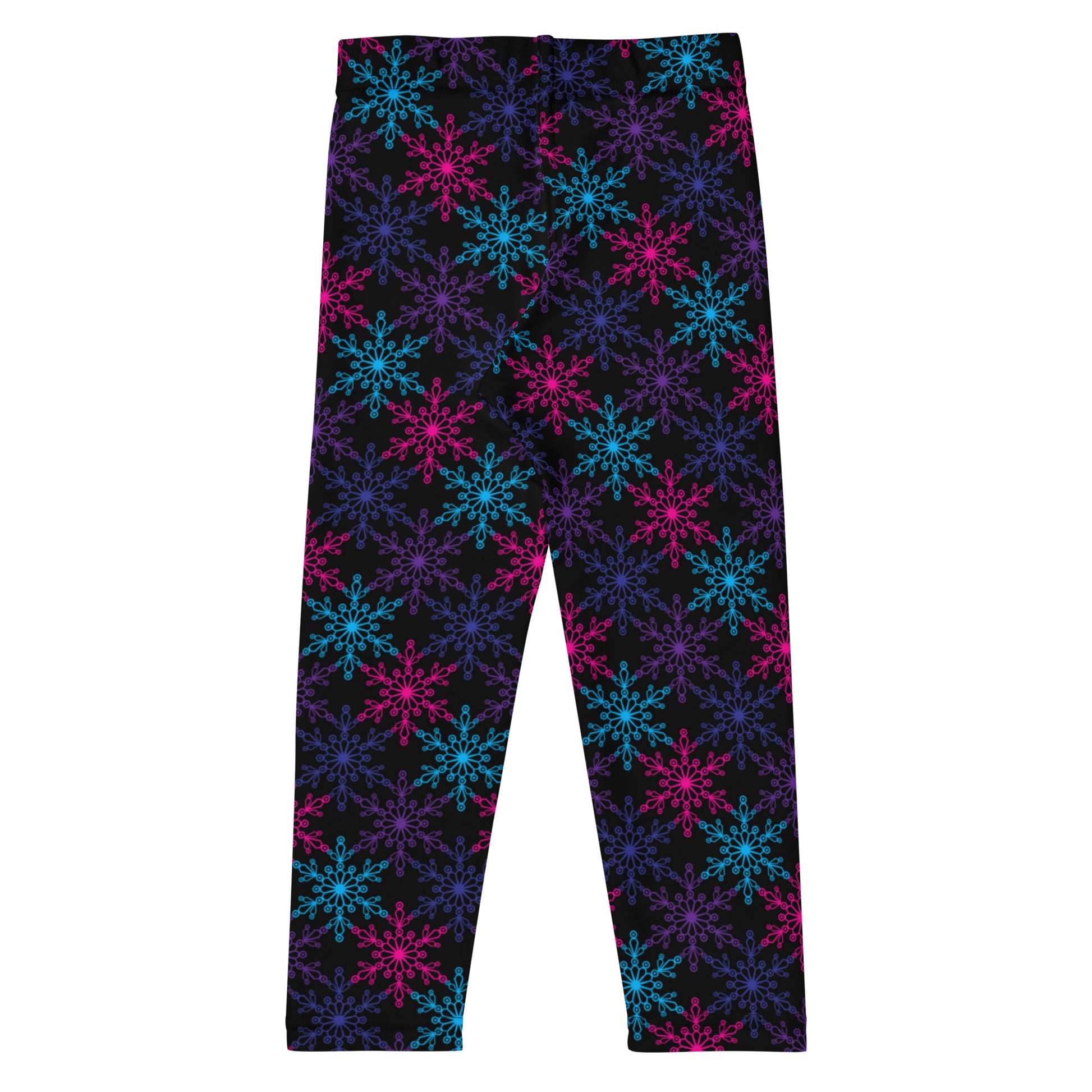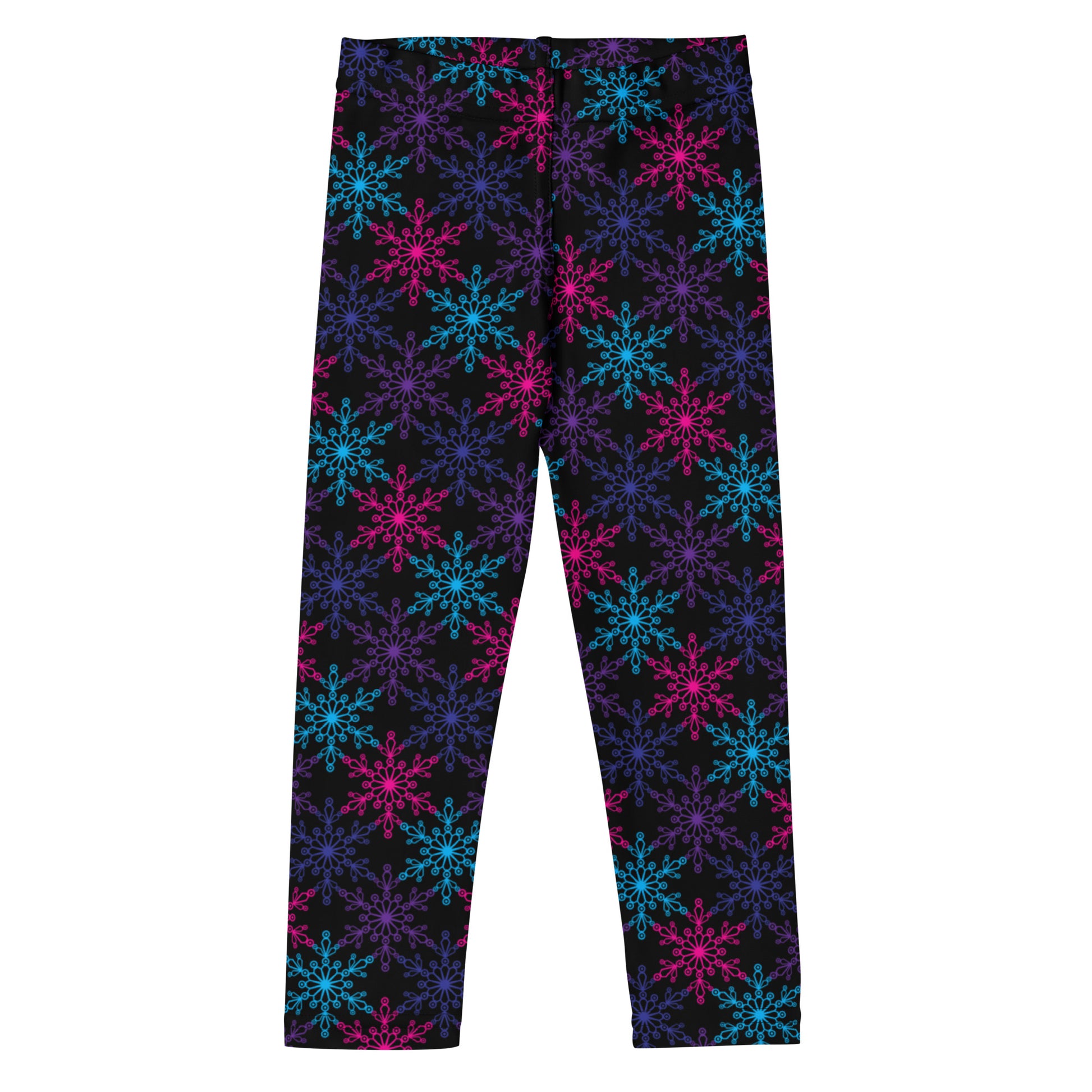 Make winter magical with these girls’ neon snowflake leggings! Designed with vibrant blue, pink, and purple snowflakes on a deep black background, these buttery soft leggings are perfect for snow days, holiday outfits, and cozy winter lounging.
