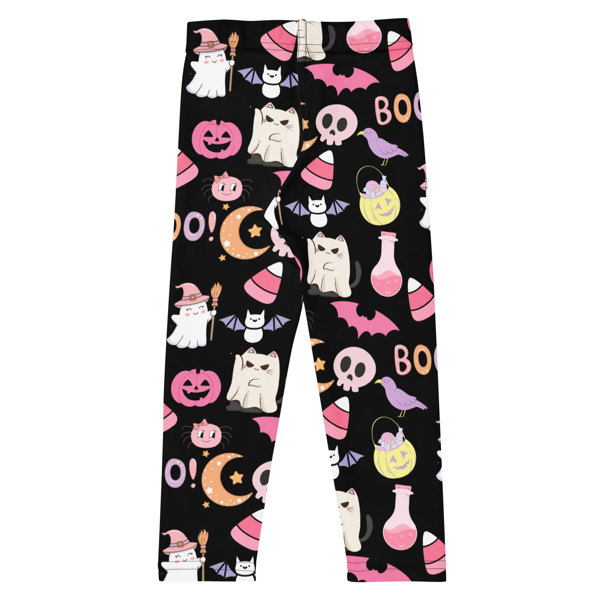These pastel Halloween leggings are spooky-sweet perfection for little girls who love all things magical and cute! Featuring an all-over print of smiling ghosts, witch hats, potion bottles, purple bats, pastel pumpkins, and kawaii black cats, this enchanting design puts a charming twist on classic Halloween style.