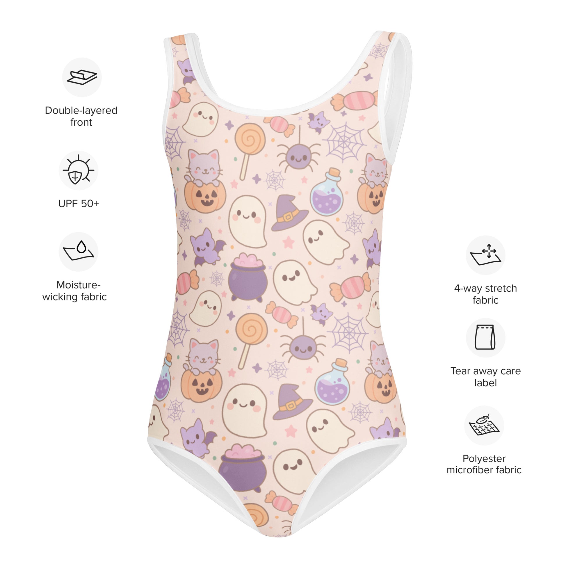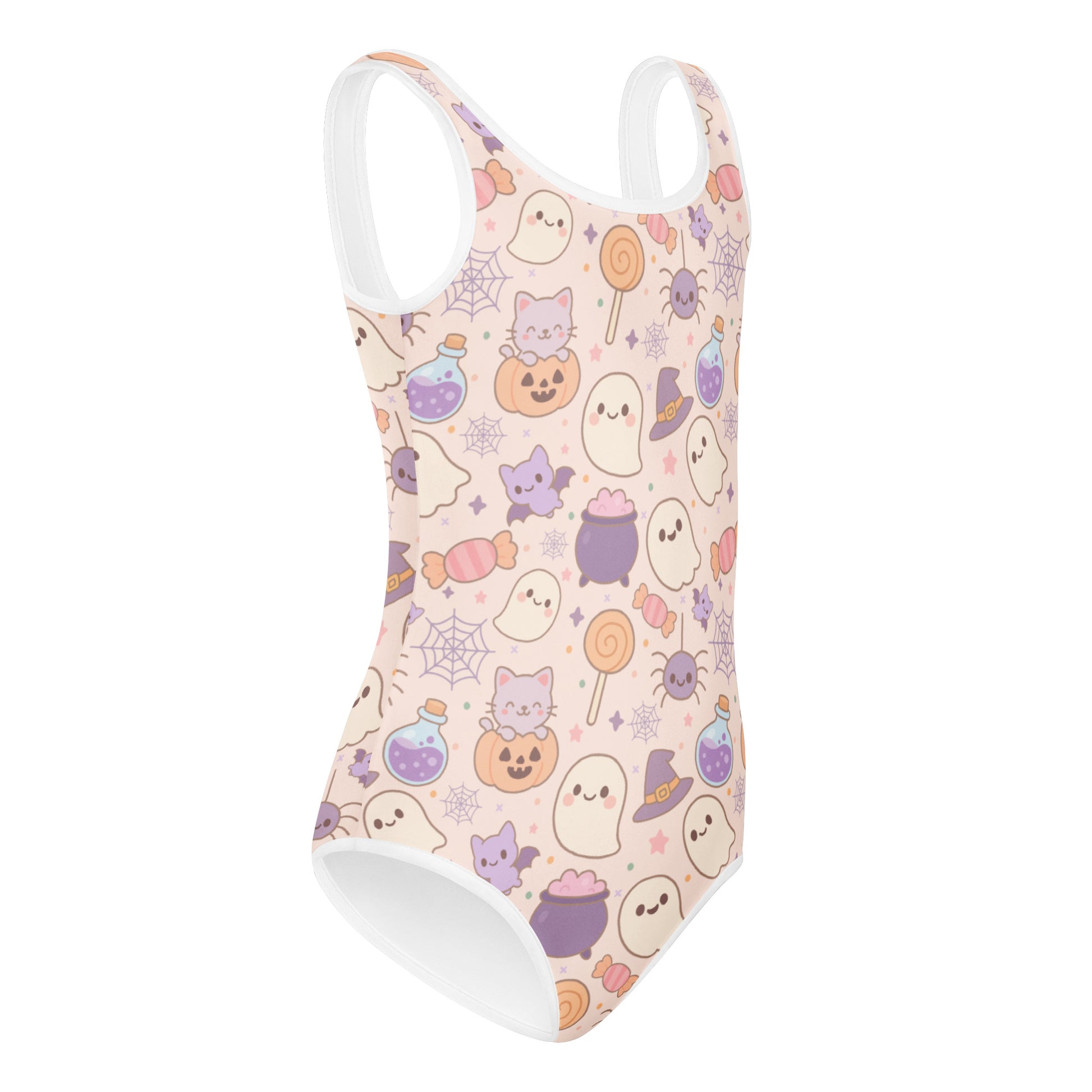 Sweeten up spooky season with this pastel Halloween leotard, covered in smiling ghosts, candy, cauldrons, cats, and bubbling potions. Designed for toddlers and girls who love to move, this soft and stretchy leotard is perfect for dance class, gymnastics, or festive fun at home.