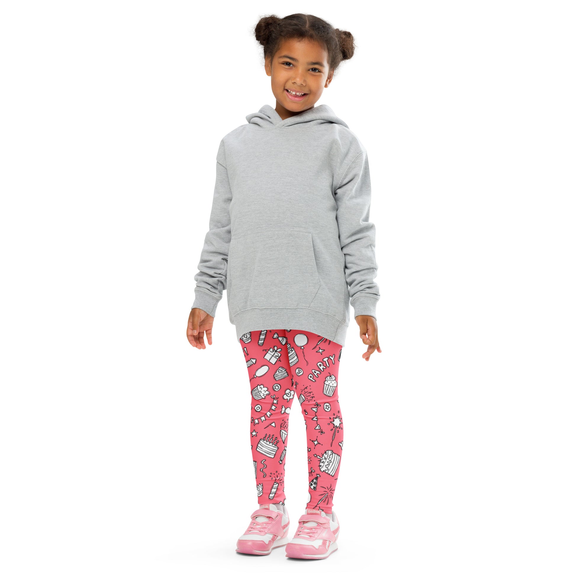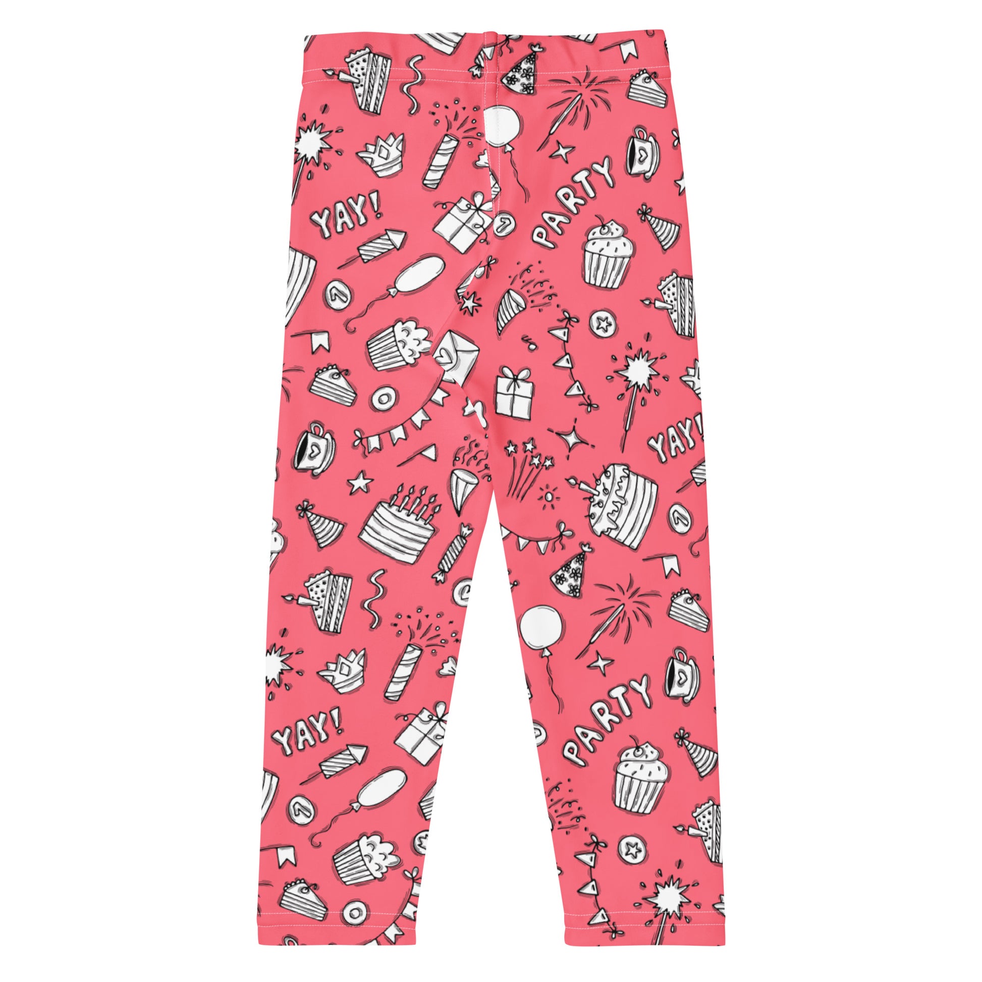 It’s always party time with these girls’ birthday-themed leggings! Bursting with fun doodles like cakes, presents, balloons, cupcakes, stars, and confetti—all on a bright pink background—these leggings are perfect for any birthday girl's celebration.