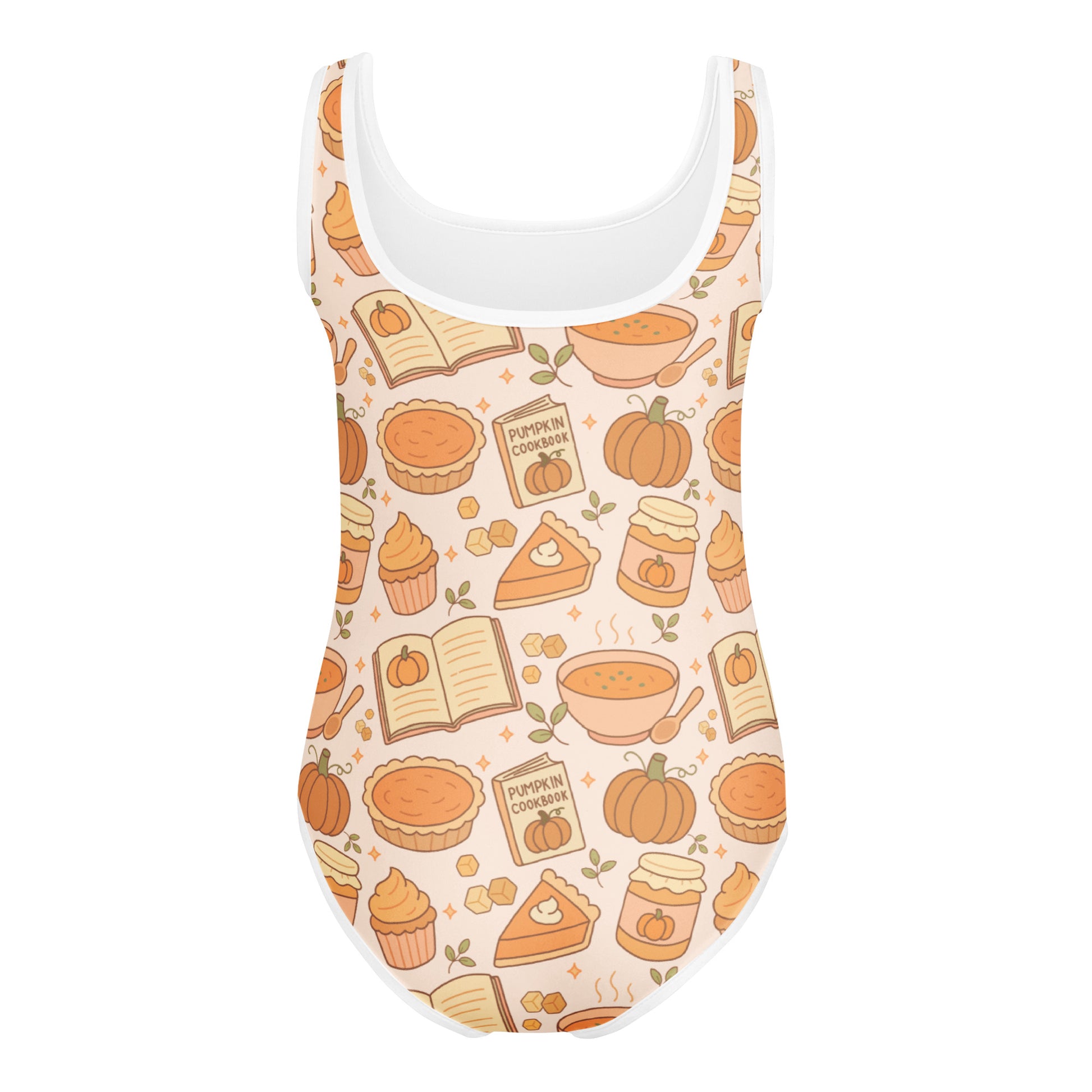Stir up some cozy autumn vibes with this girls pumpkin recipe leotard—designed for toddlers and little chefs in the making. Featuring pies, cookbooks, cupcakes, soup bowls, and pumpkins galore, this fall-themed leotard is perfect for dance class, gymnastics, or twirling through the kitchen while someone bakes.