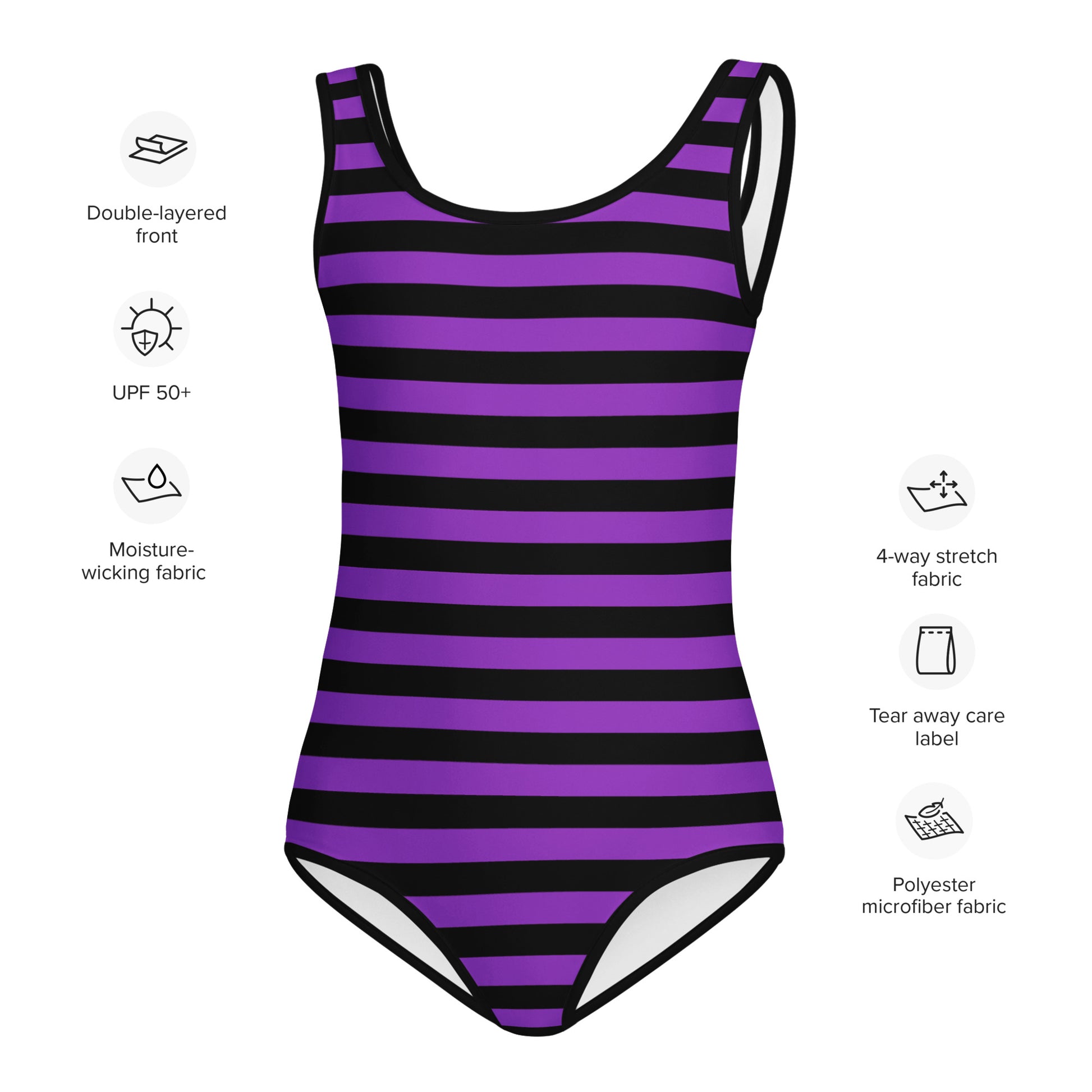 Classic Halloween vibes meet beach-day fun in this purple and black striped swimsuit, perfect for kids who love the spooky season and making waves. With bold horizontal stripes and a sleek black trim, this one-piece delivers fun colors that are just right for October adventures.