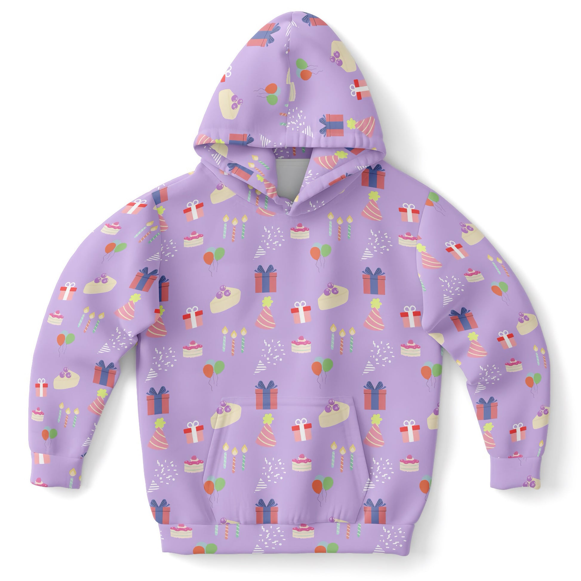 Featuring colorful balloons, birthday cakes, presents, candles, and party hats on a lavender background, this sweatshirt is perfect for toddlers, kids, and teens who love birthdays. Soft, cozy, and durable, it’s great for birthday parties.