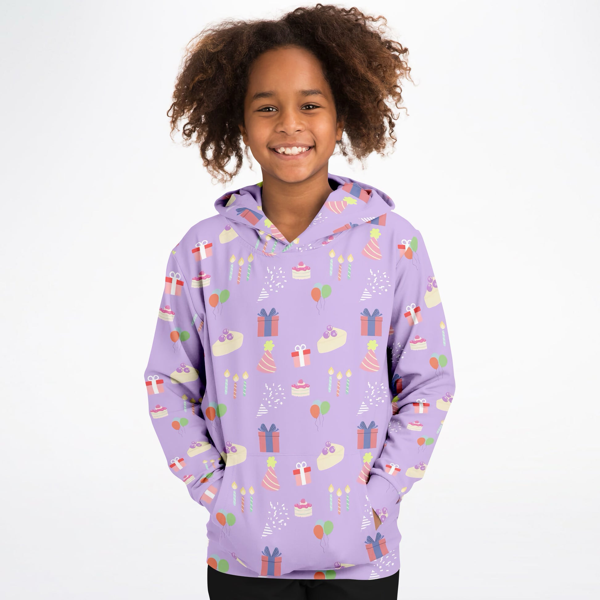 Girls Purple Birthday Pattern Hoodie – Cozy Cotton Fleece or Lightweight Sports Fabric