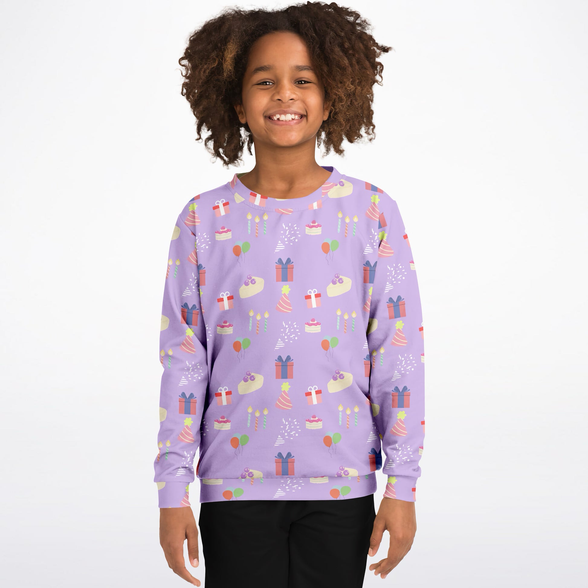 Turn every day into a celebration with this Kids Birthday Party Sweatshirt! Featuring cakes, candles, balloons, and presents on a pastel purple background, this cheerful pullover is perfect for toddlers and older kids.