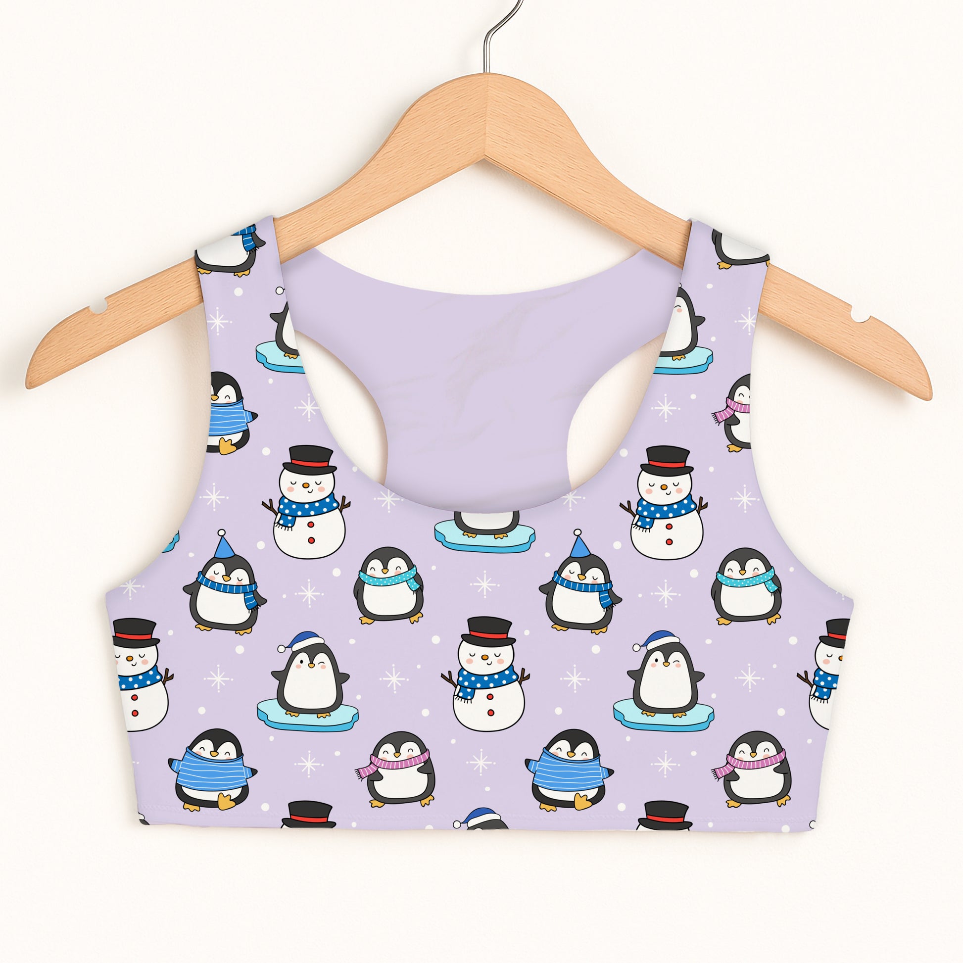 Bring on the winter fun with this adorable girls’ penguin sports bra! Featuring cheerful penguins and snowmen dressed in cozy scarves and hats on a soft lavender background, this top adds frosty charm to every outfit. Perfect for holiday season workouts, dance practice, or everyday play, it combines comfort with playful winter style.