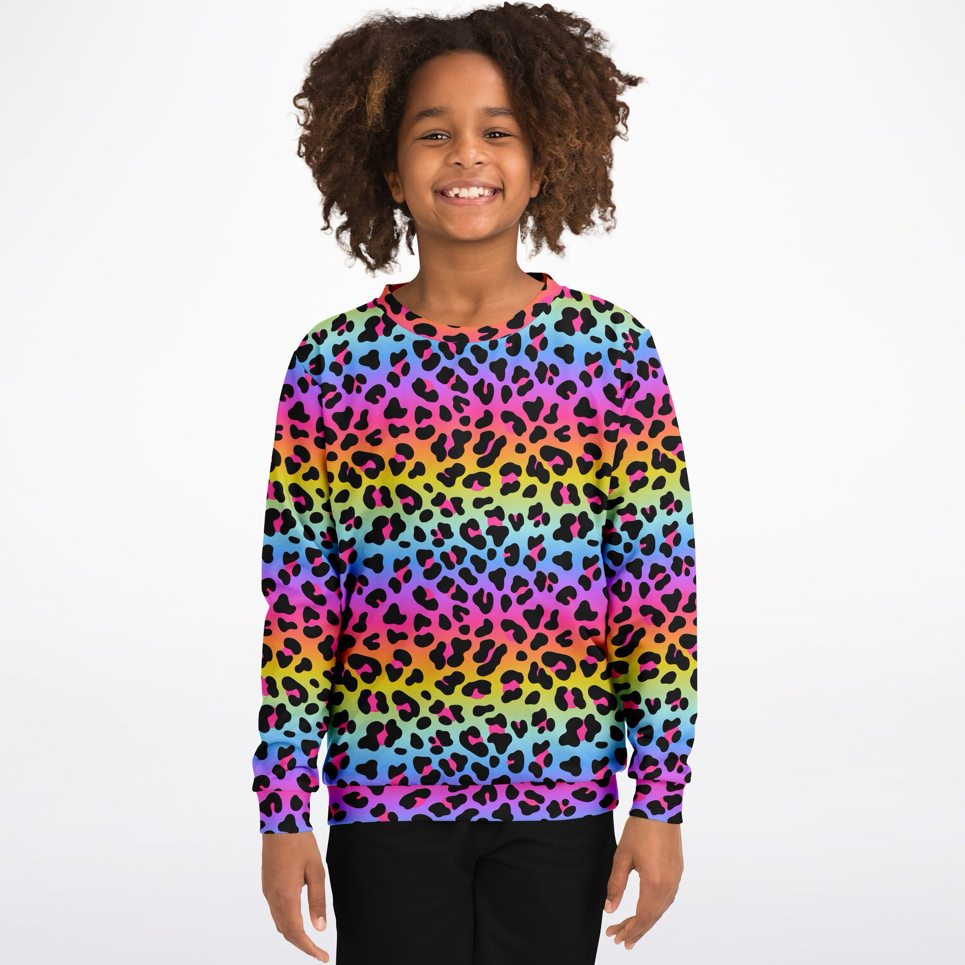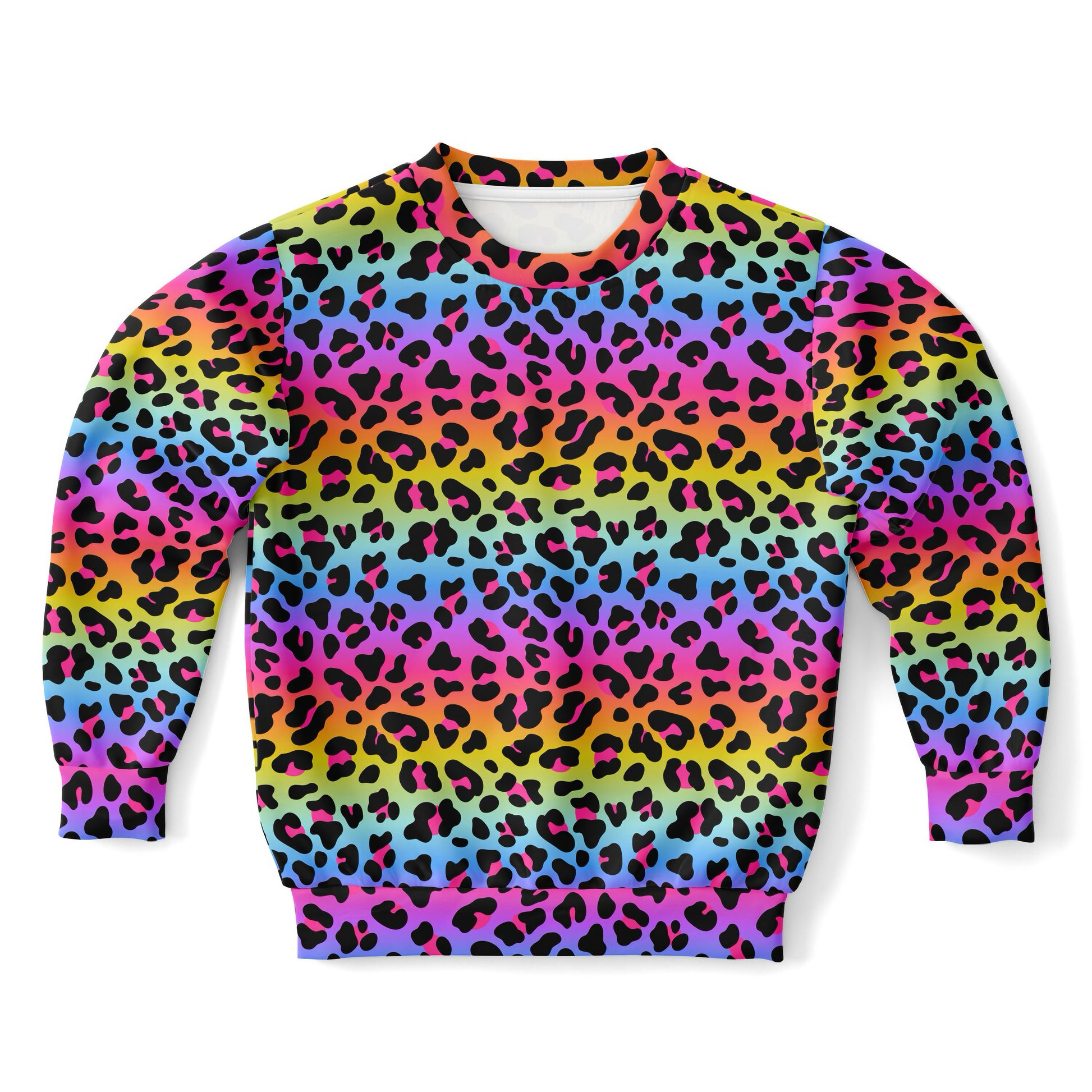 Girls Rainbow Leopard Sweatshirt – Cozy Cotton Fleece or Lightweight Sports Fabric