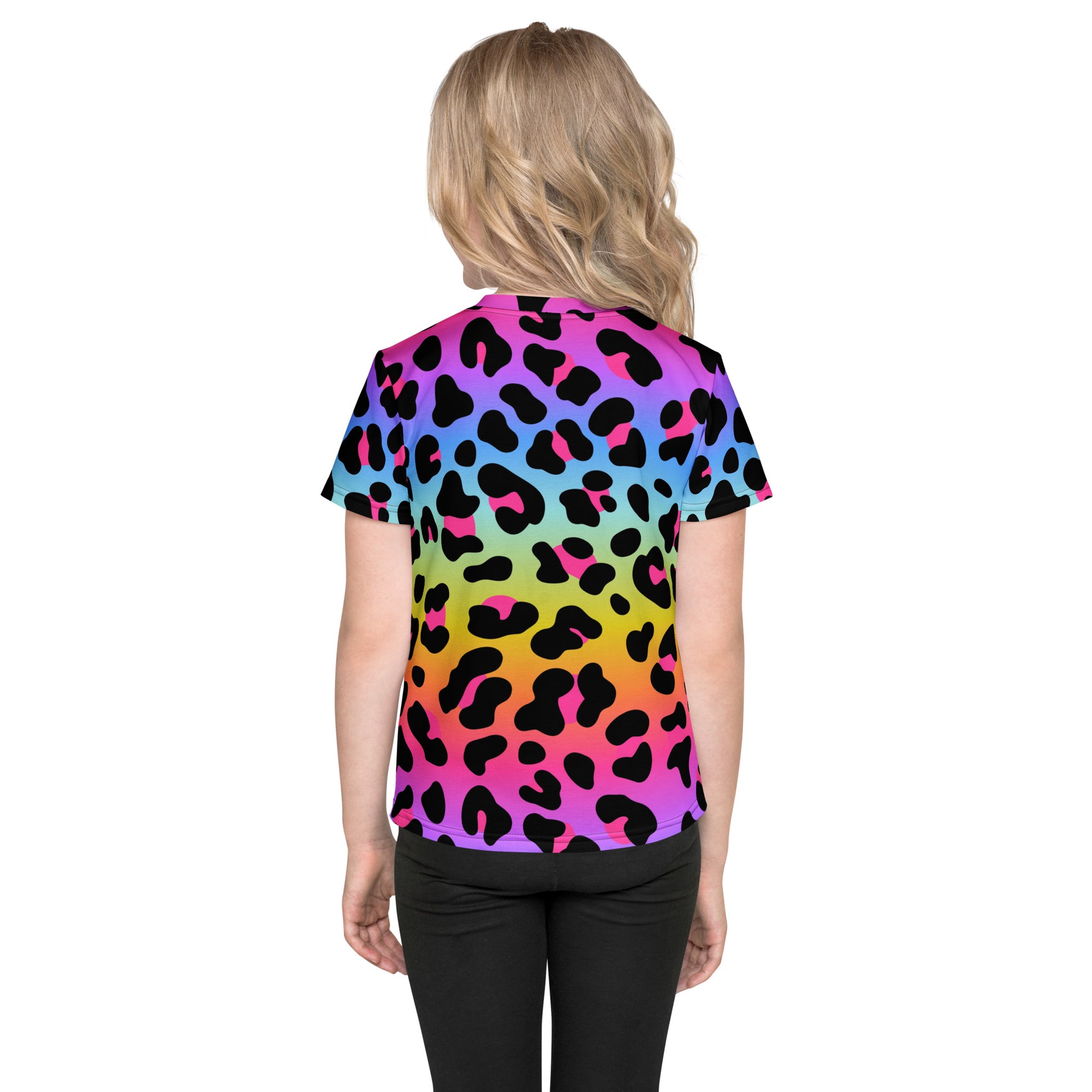 Colorful Leopard Design: A bold rainbow twist on the classic animal print gives this shirt a fun, fearless vibe that’s easy to pair with leggings, shorts, or jeans.