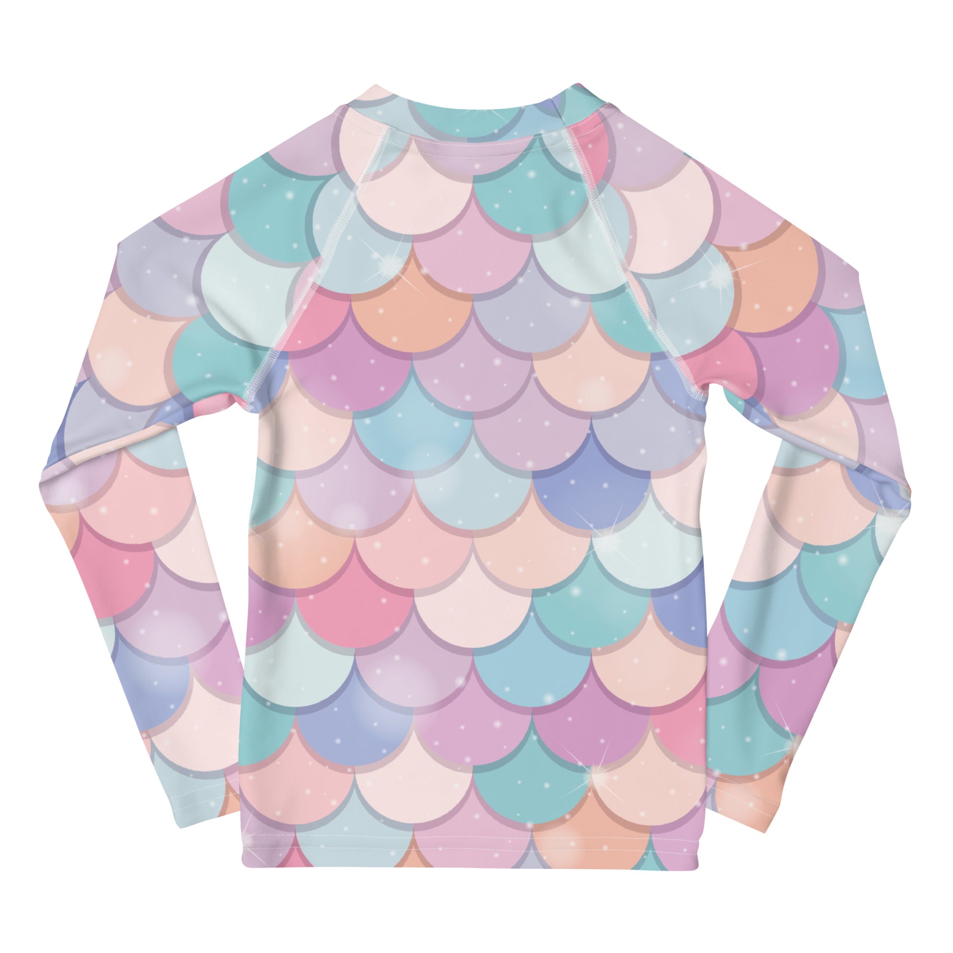 Girls Rainbow Mermaid Scales Long Sleeve Rash Guard Swim Shirt With UPF 50+