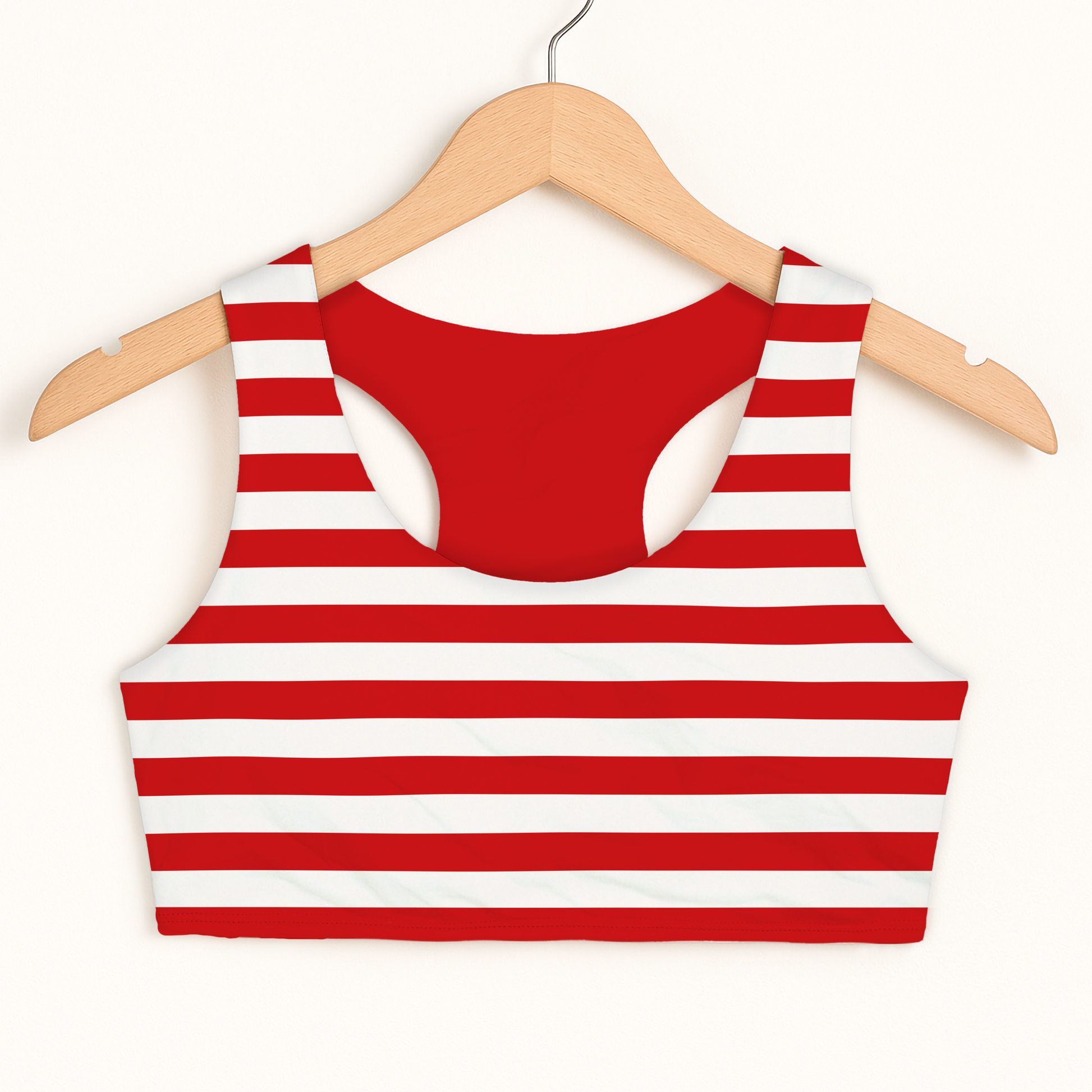 This girls’ striped sports bra brings candy cane cheer to her holiday wardrobe. With bold red and white stripes, it’s perfect for Christmas outfits, festive dance recitals, cheerleading, gymnastics, or simply celebrating the season in style. Whether layered under a hoodie or worn with matching leggings, it’s a holiday-ready look she’ll love.
