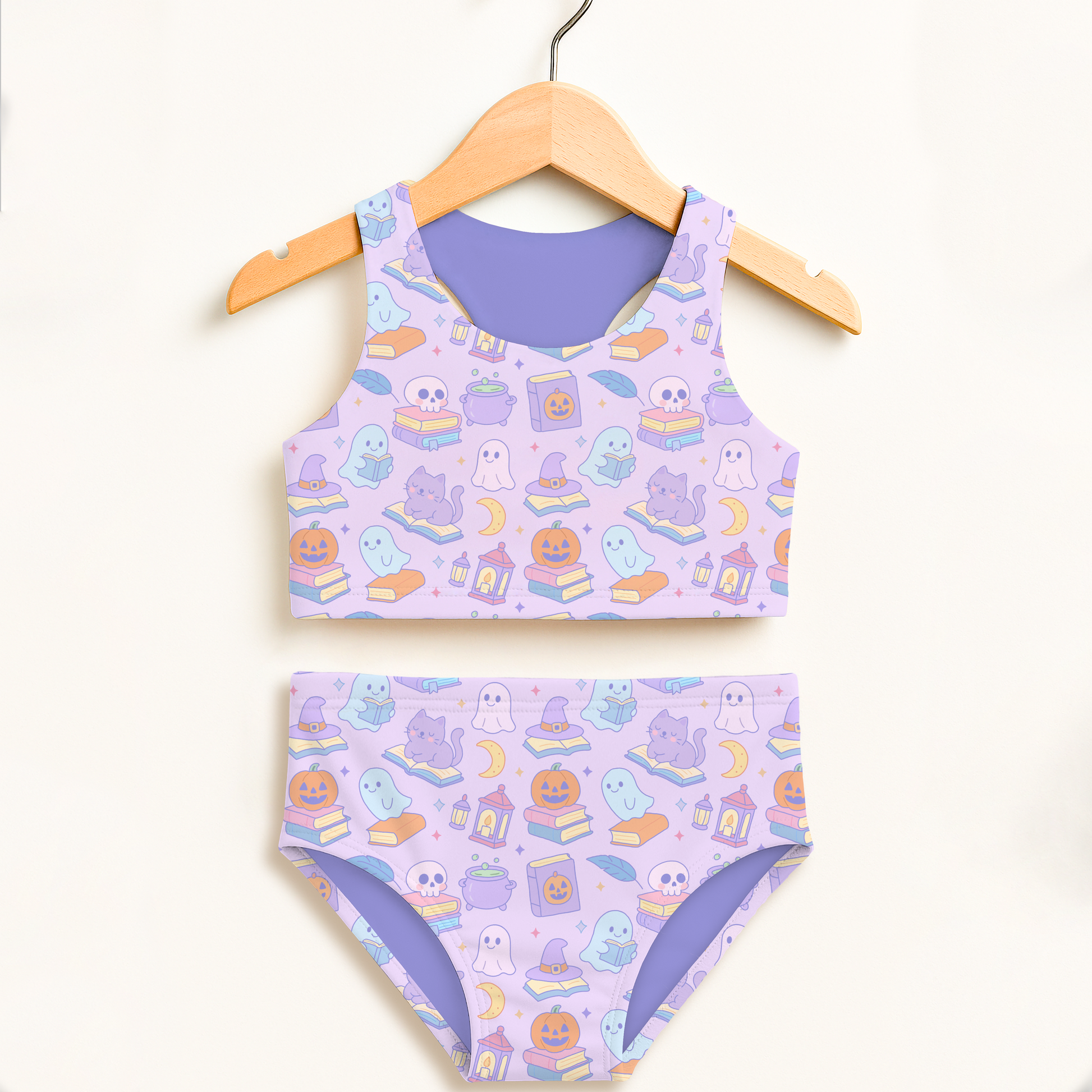 Let her make a splash in magical Halloween style with this Girls Pastel Ghost Books Two Piece Swimsuit. Featuring whimsical ghosts, cats, pumpkins, spell books, black cats, and lanterns on a soft lilac background, this spooky-cute design is perfect for pool parties, vacations, or trick-or-treat season fun. The racerback top and modest high-waisted bottoms provide secure coverage, while the elastic waistband and double-layered fabric add lasting comfort and support.