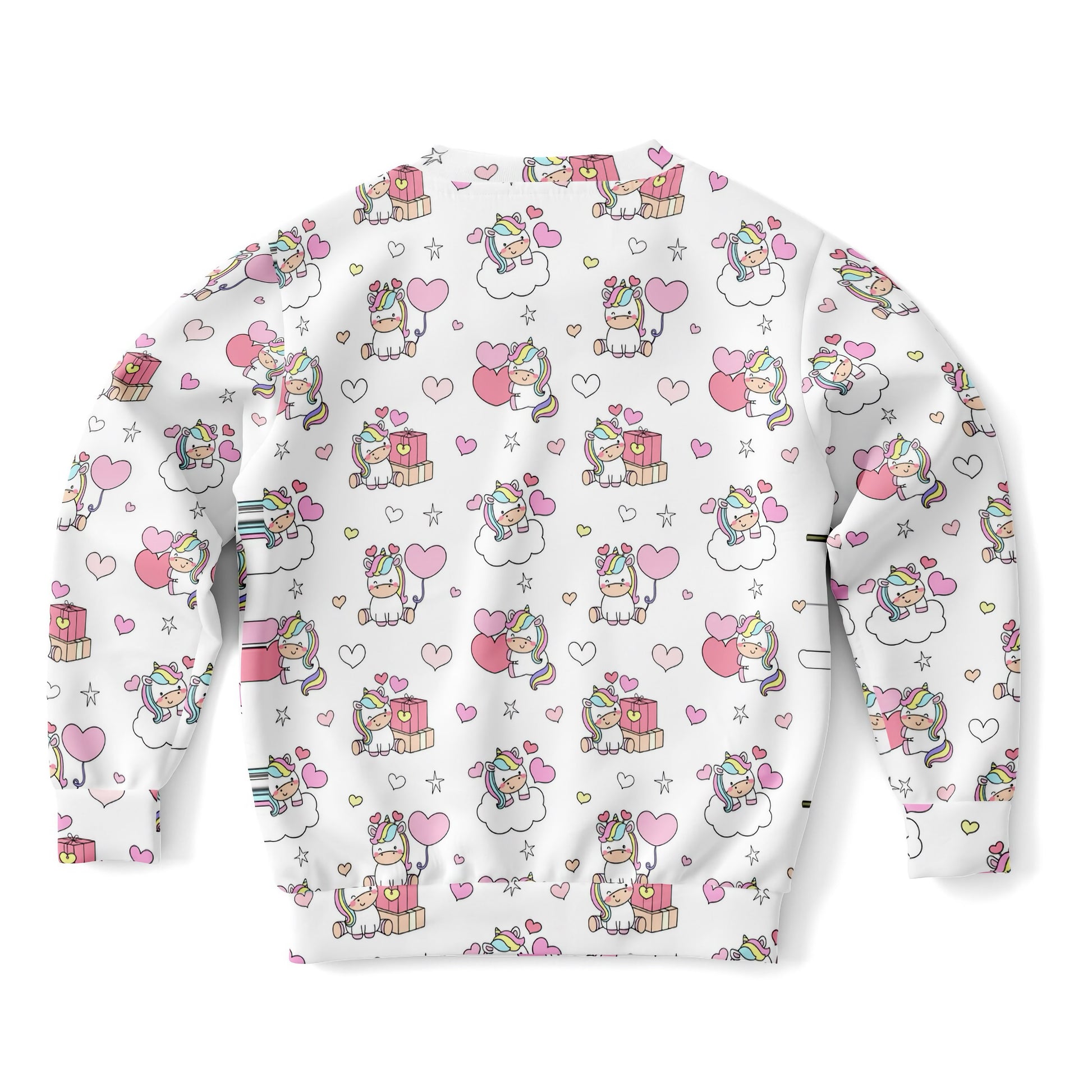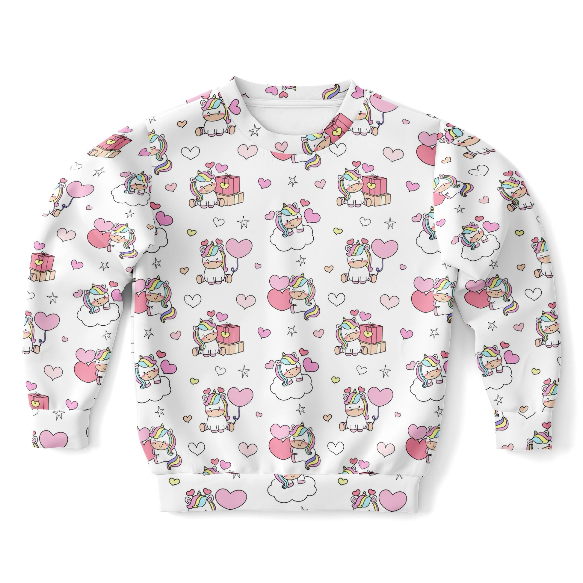 Make her special day even more magical with this Kids Unicorn Birthday Sweatshirt! Covered in rainbow unicorns, hearts, balloons, and presents on a crisp white background, this pullover is perfect for toddlers and older kids.