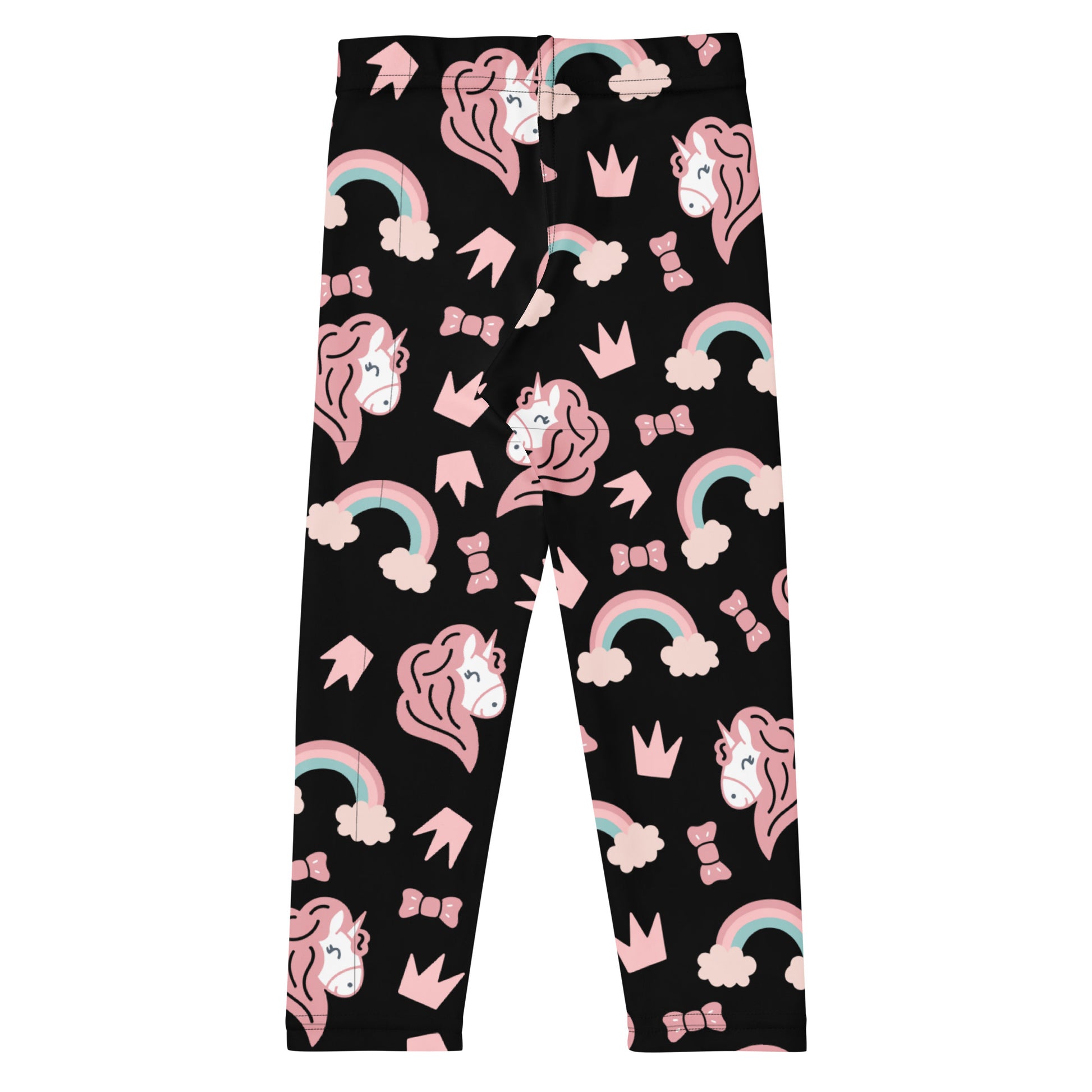 For the girl who believes in magic, sparkles, and standing out. These pink unicorn leggings on a bold black background are the ultimate statement piece—featuring dreamy rainbows, pastel clouds, princess crowns, and cute little bows for extra charm.