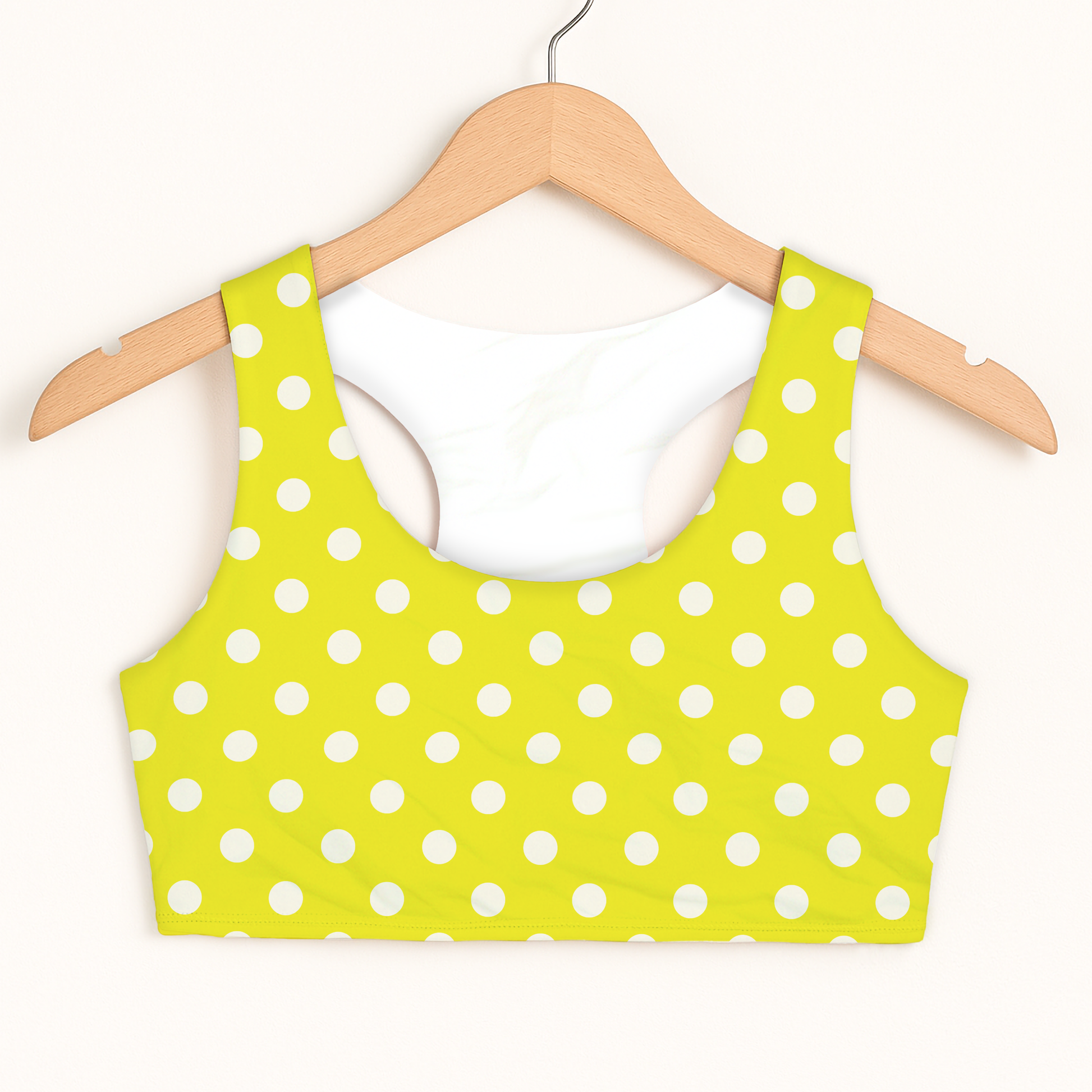Bring sunshine and smiles to her activewear with this cheerful yellow polka dot sports bra! Featuring a bright lemon-yellow background with crisp white dots, this retro-inspired design is playful, energetic, and perfect for girls who love bold, happy colors. Ideal for gymnastics, dance, sports, or just everyday fun.