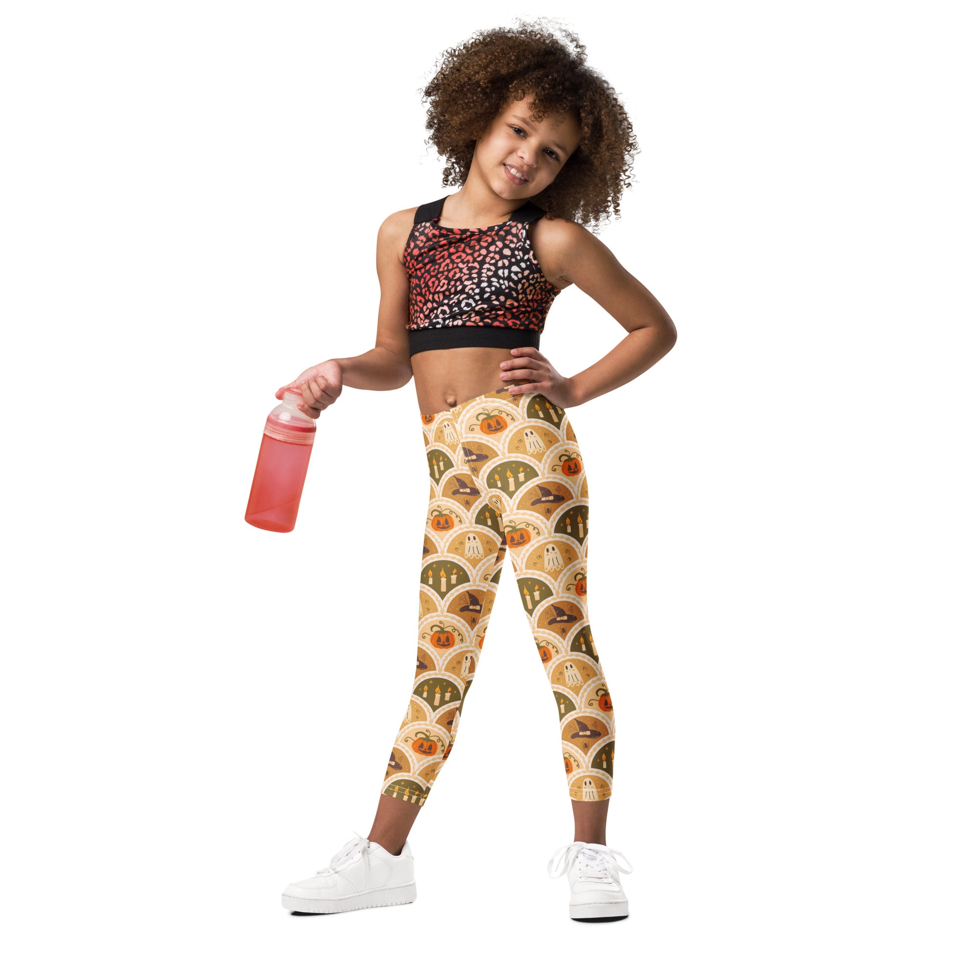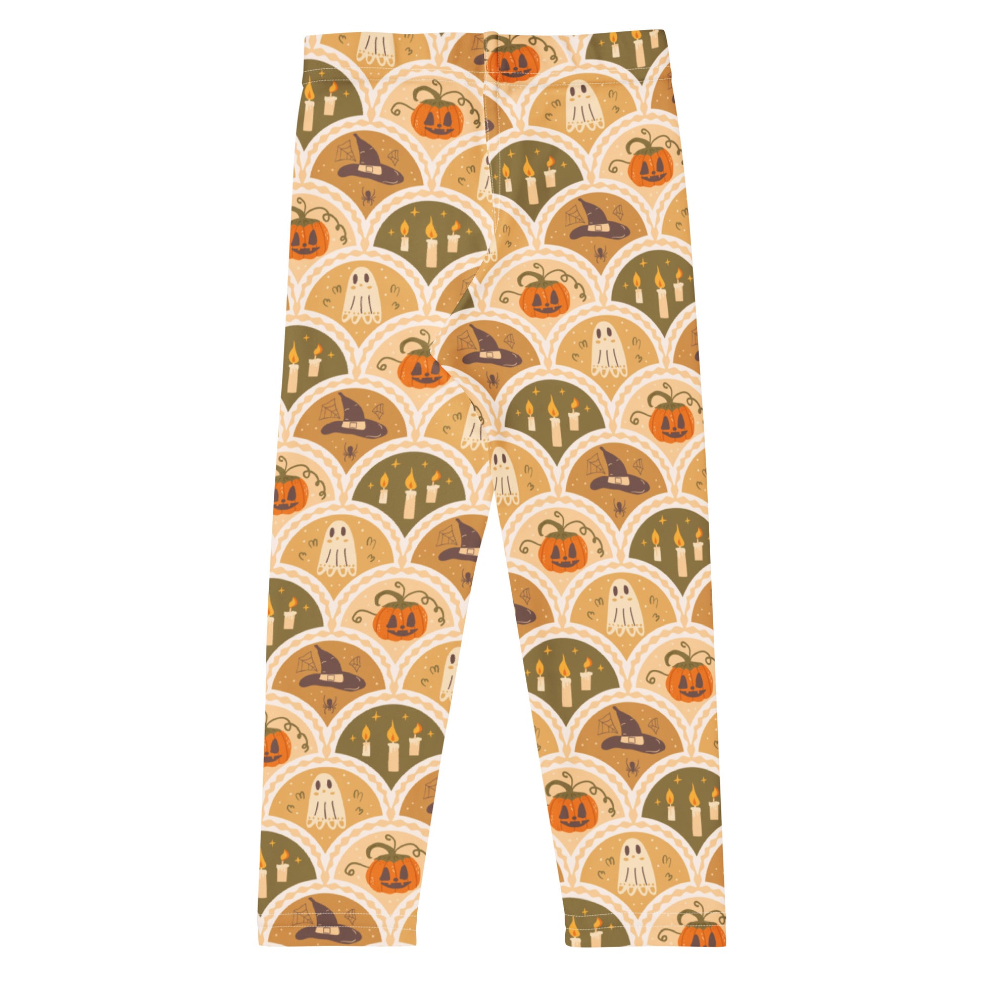 Halloween charm meets kid-approved comfort in these autumn-style leggings! Featuring a repeating pattern of pumpkins, ghosts, witches’ hats, and candles in earthy fall tones—these leggings give a fall season twist to spooky season style.