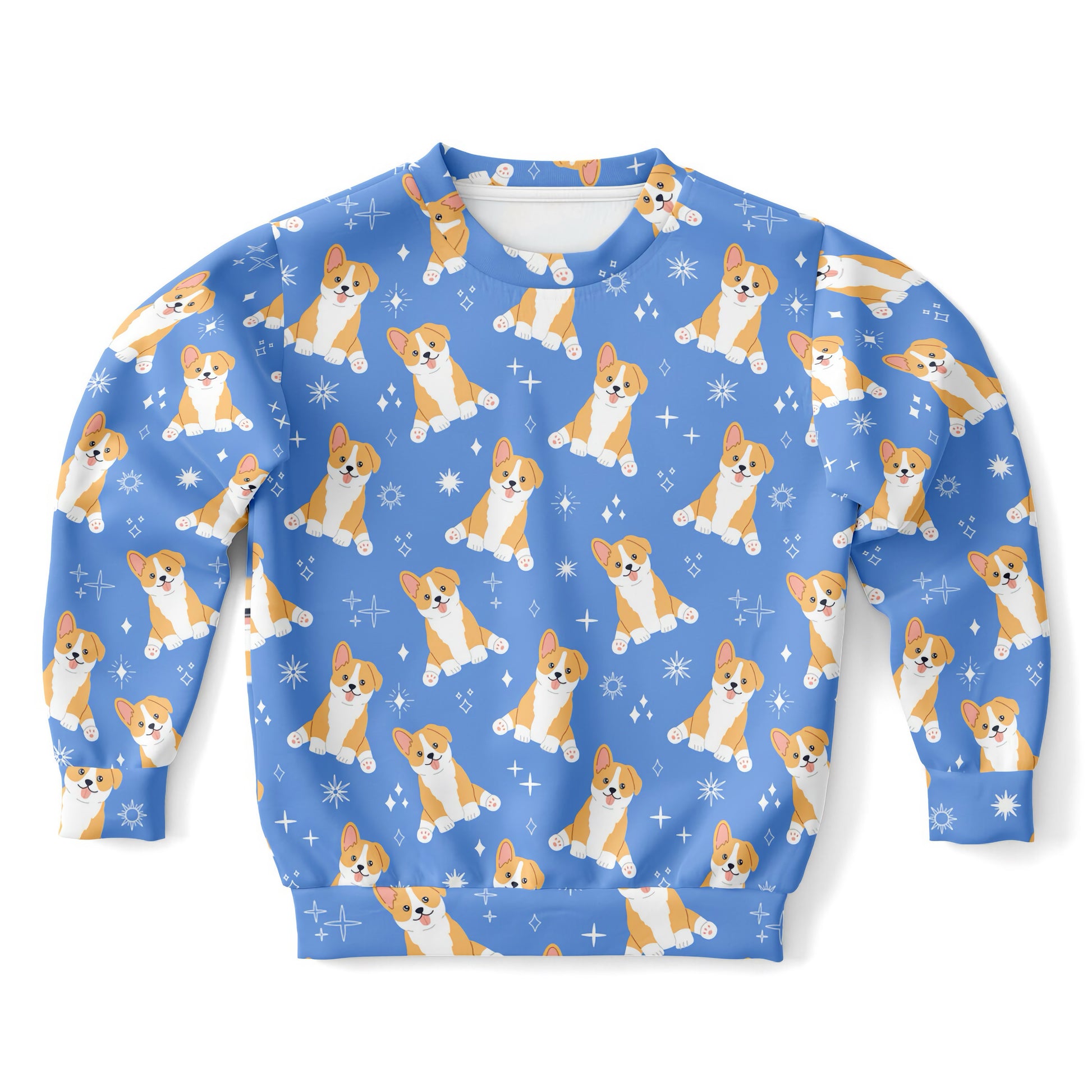 Kids Blue Corgi Dog Sweatshirt – Cozy Cotton Fleece or Lightweight Sports Fabric