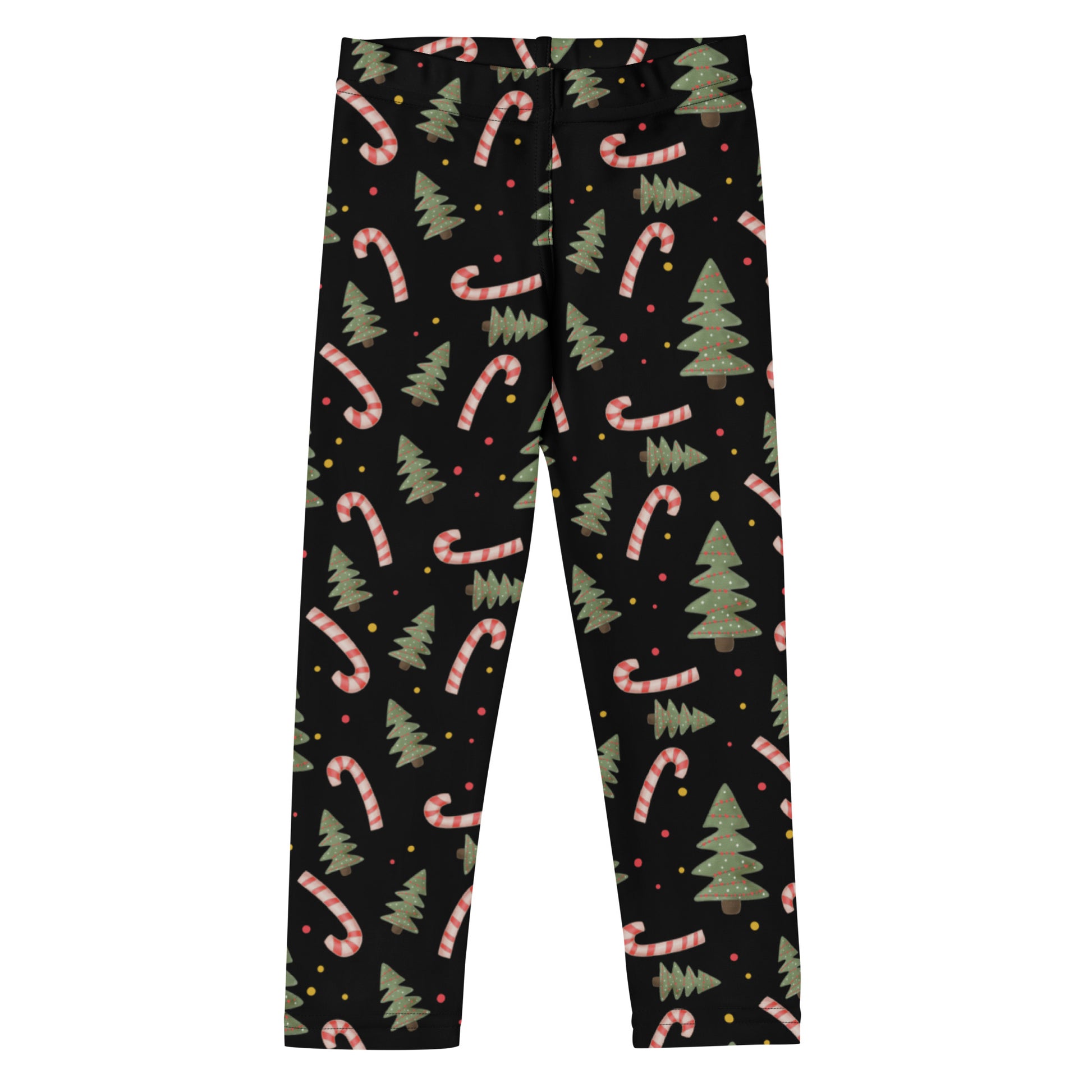 Make holiday mornings extra magical with these festive Christmas leggings for kids! Featuring a cheerful print of candy canes, Christmas trees, and colorful dots on a deep black background, these buttery soft leggings are perfect for girls and boys to wear all December long—from cozy mornings to school parties and family photos.