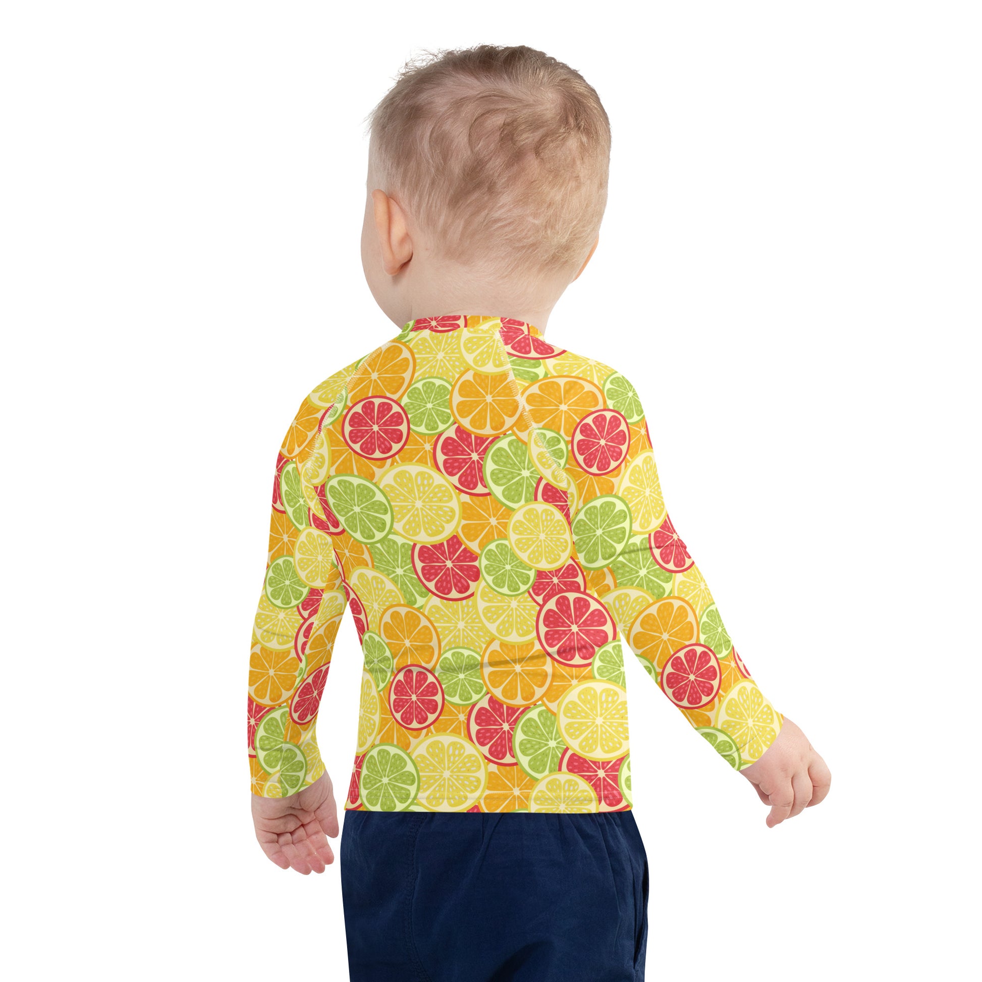 Add a zesty splash of color to their swim days with this kids' citrus fruit long sleeve rash guard swim shirt! Bursting with bright lemon, lime, orange, and grapefruit slices, this fruity swim top is perfect for toddlers and kids who love fun, energetic designs. With UPF 50+ sun protection, it keeps little ones safe while they soak up the sunshine.