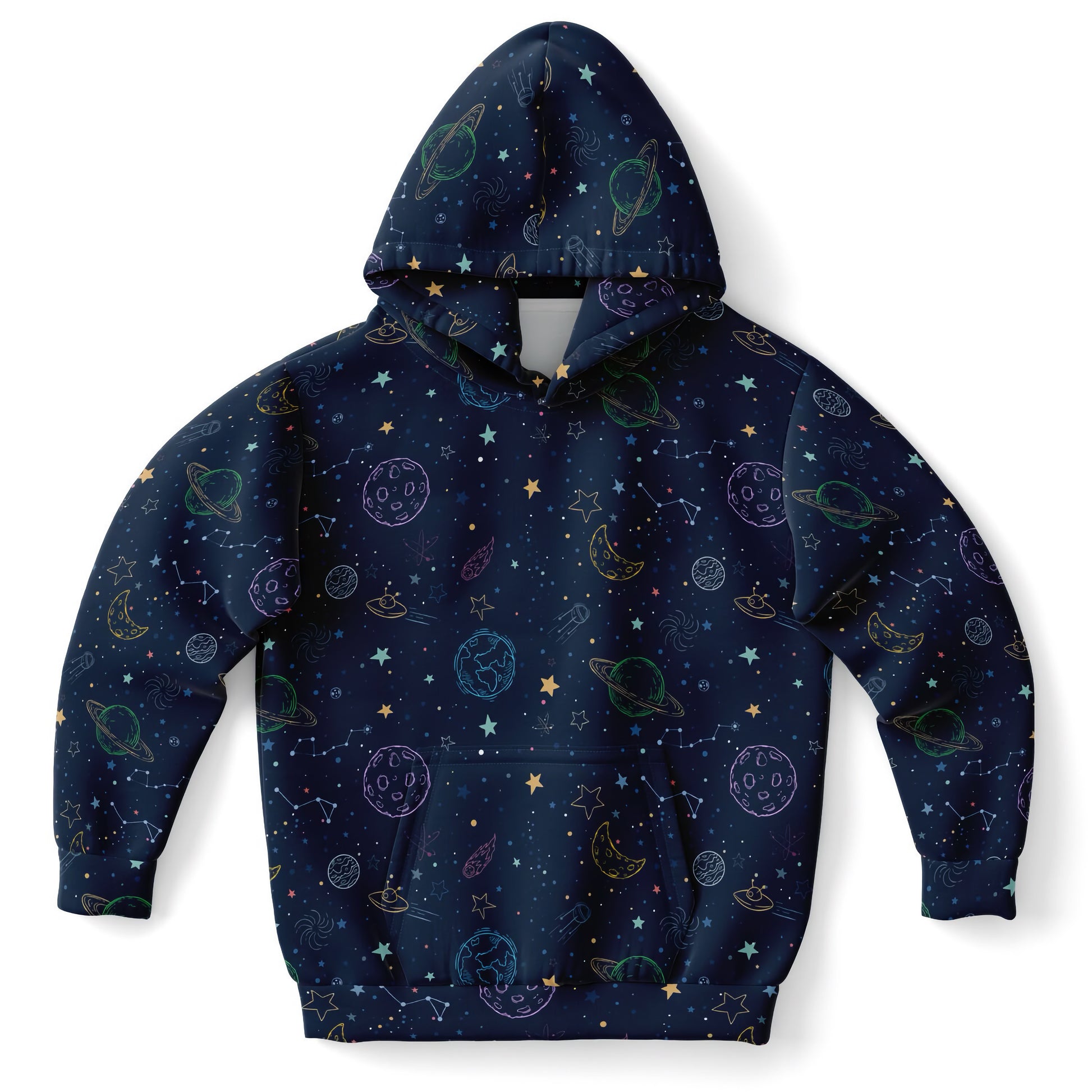 Inspire their imagination with the Kids Galaxy Hoodie. Featuring a deep navy background covered in planets, moons, stars, and constellations, this sweatshirt is perfect for toddlers, kids, and teens who love space and science. Whether they're stargazing, heading to school, or cozying up at home, this hoodie combines comfort with an out-of-this-world design.
