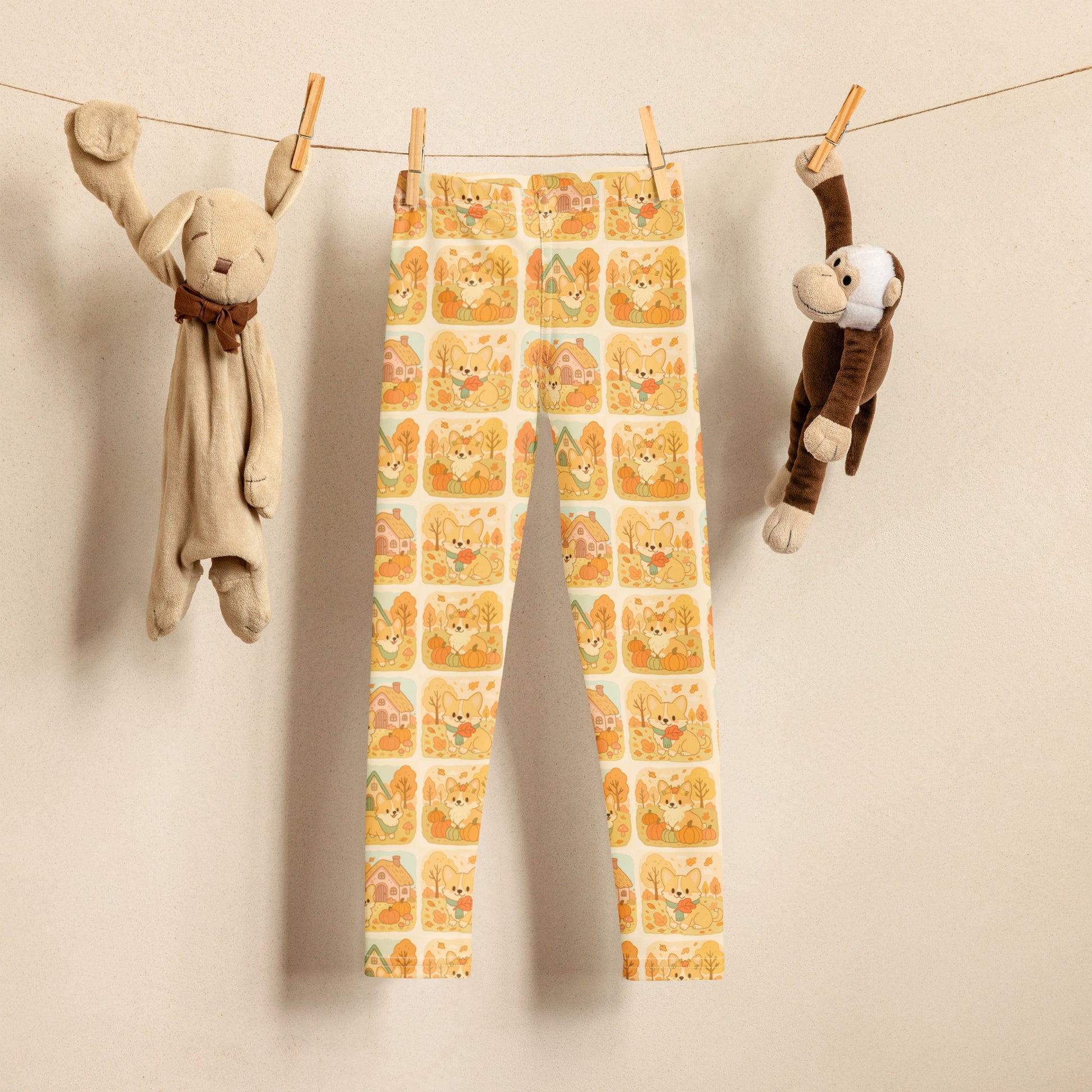 Let their fall wardrobe go full cozy with these adorable leggings featuring Corgis with pumpkins and autumn maple leaves! Each square of this illustrated print is like a storybook scene—complete with fluffy Corgis wearing scarves, piles of pumpkins, cozy cottages, fluttering leaves, and mushroom-dotted land. Ideal for school, playdates, family photos, or a pumpkin spice kind of day!