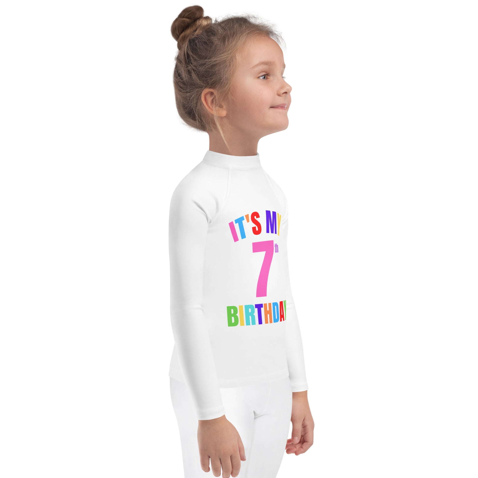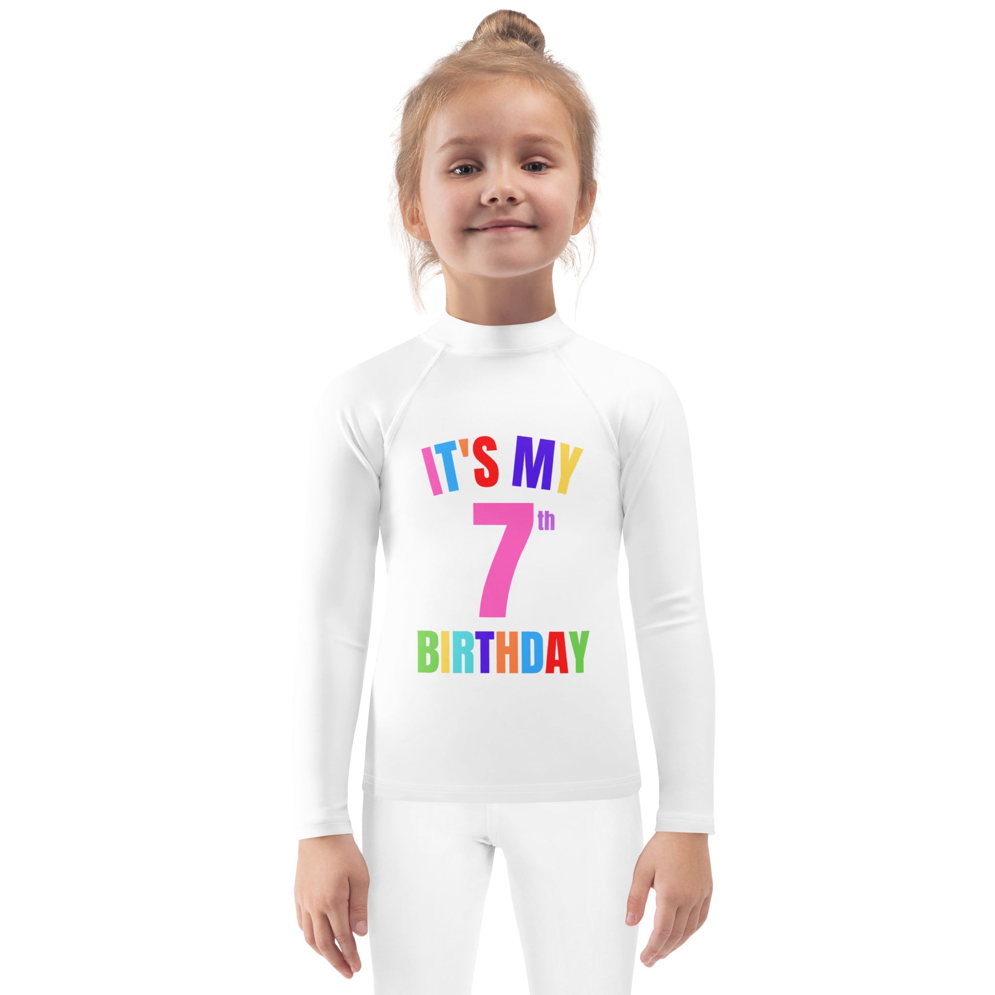 Let your little one make a splash on their big day with this customizable birthday long sleeve swim shirt! Featuring bold, colorful lettering and a giant pink number, this toddler and kids rash guard is perfect for pool parties, beach birthdays, or just soaking up birthday attention.