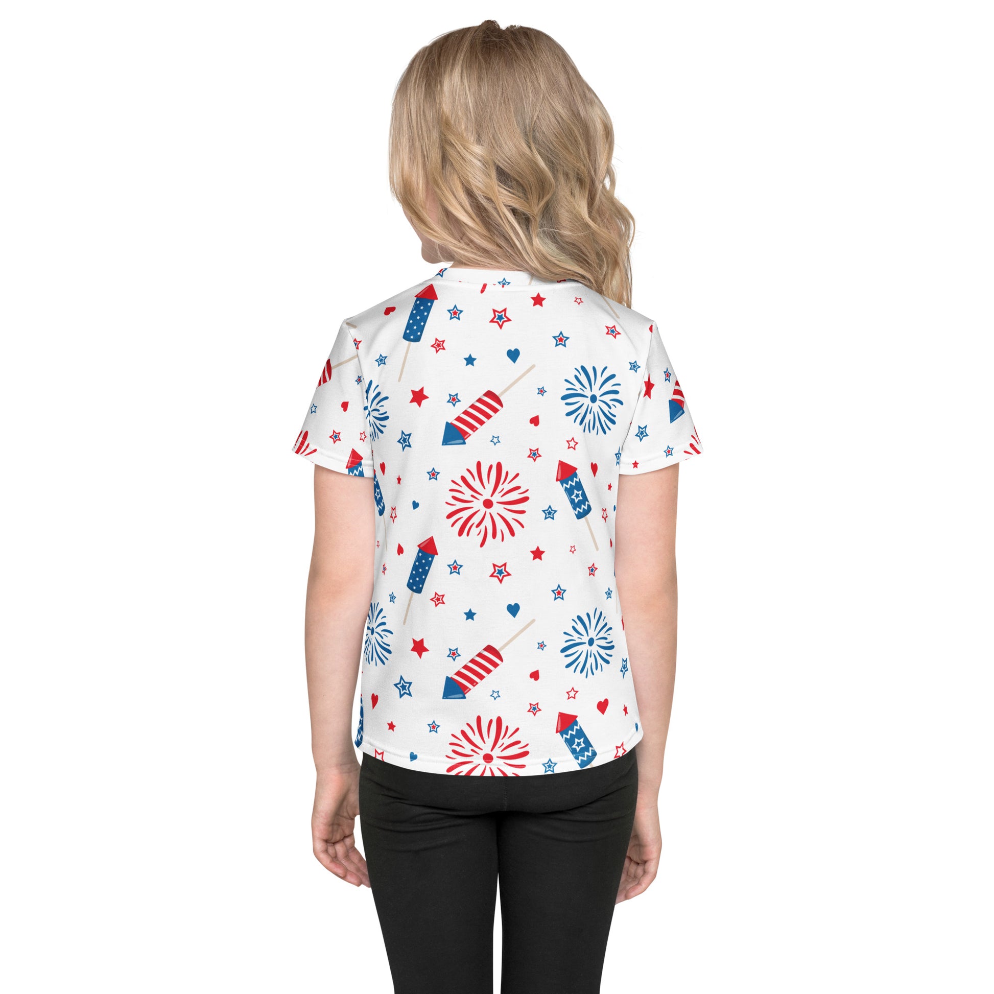 Get your little one celebration-ready with this Kids Fireworks & Rockets USA T-Shirt! Featuring an all-over print of patriotic rockets, bursting fireworks, and star-spangled shapes, it’s the perfect tee for parades, parties, and everything red, white, and boom.