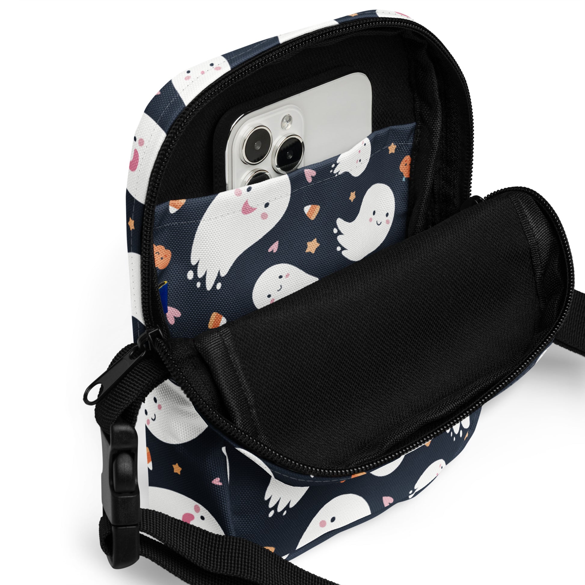 Spooky-sweet and totally adorable, this Kids Halloween Crossbody Bag features a navy blue background with happy white ghosts, candy corn, orange pumpkins, stars, and pastel pink hearts. It's a charming fall accessory for toddlers and kids who love Halloween fun without the fright! Whether heading to school, a costume party, or trick-or-treating, this playful mini purse is the perfect companion.