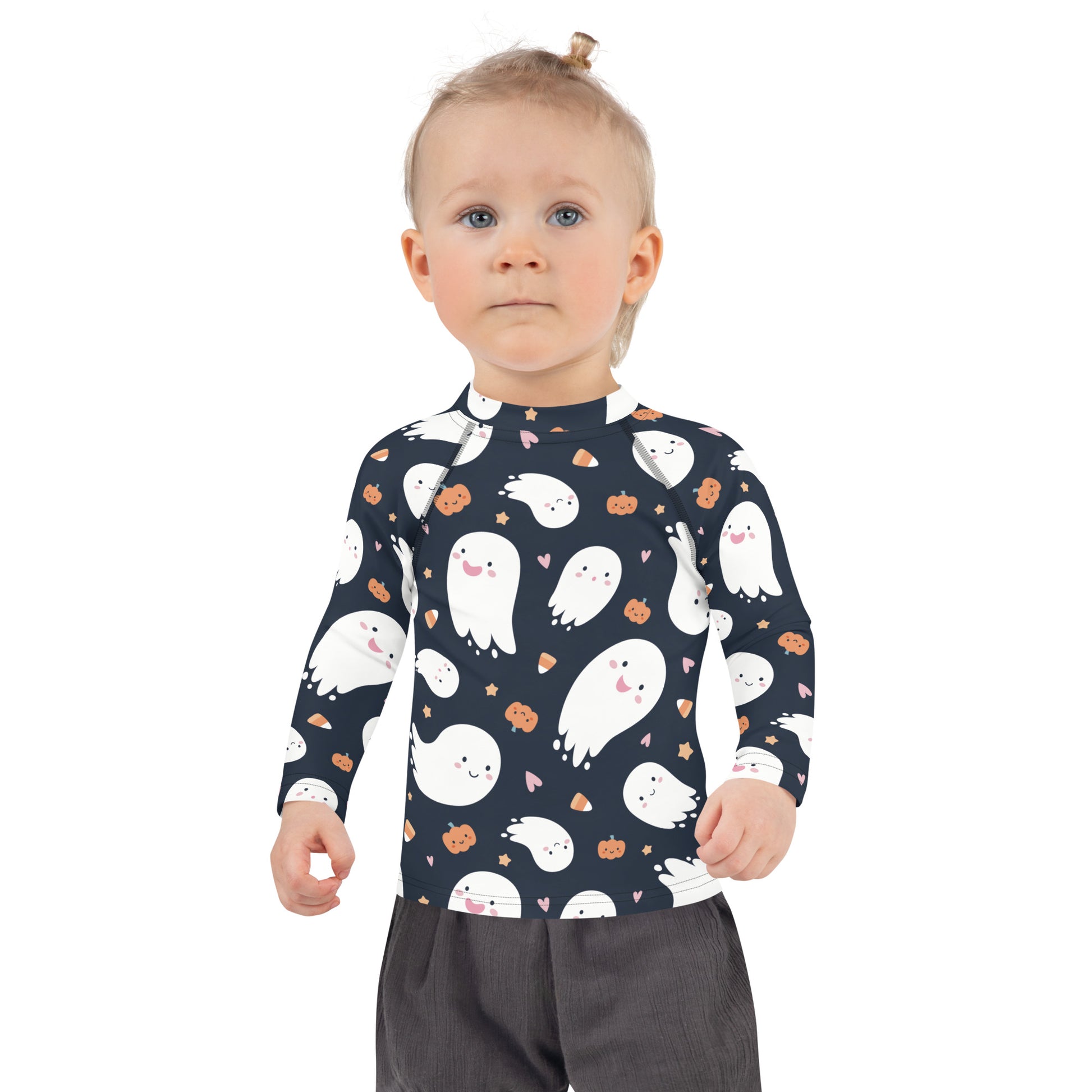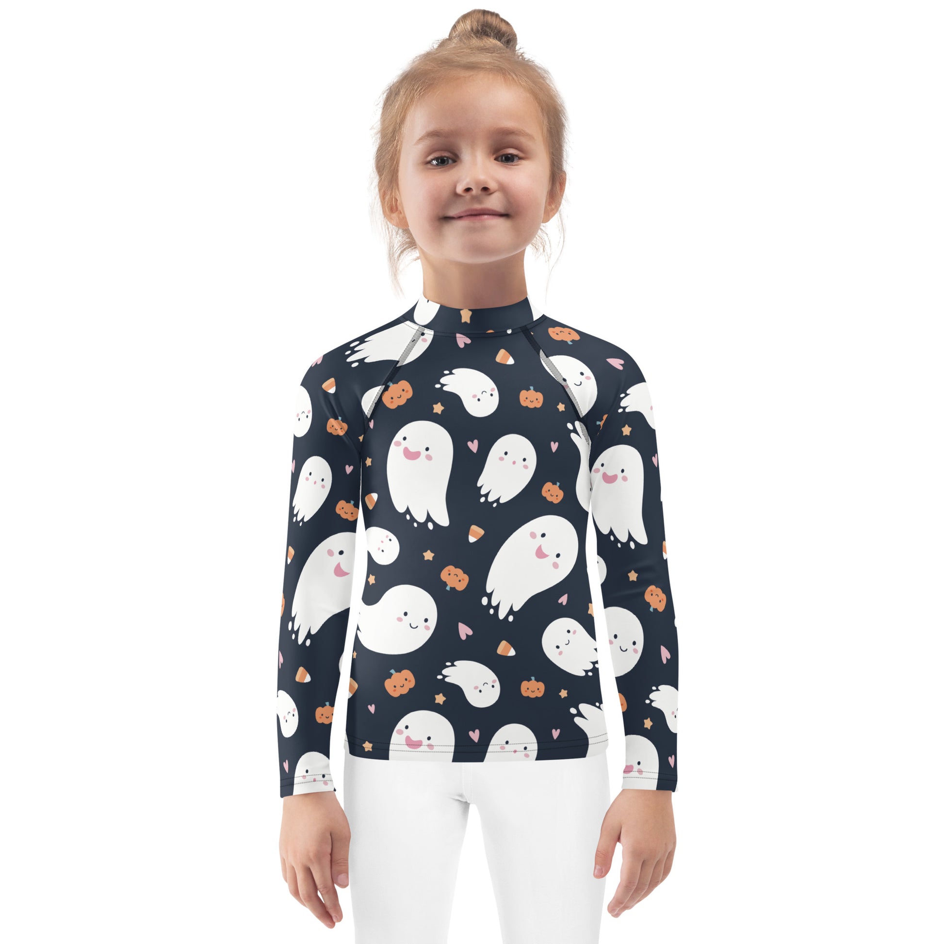 Care Instructions: To keep your Rash Guard looking spooktacular, rinse it thoroughly after each swim to remove any chlorine or salt residue. Avoid contact with rough pool edges to preserve the hauntingly delightful ghost design for many aquatic adventures to come.